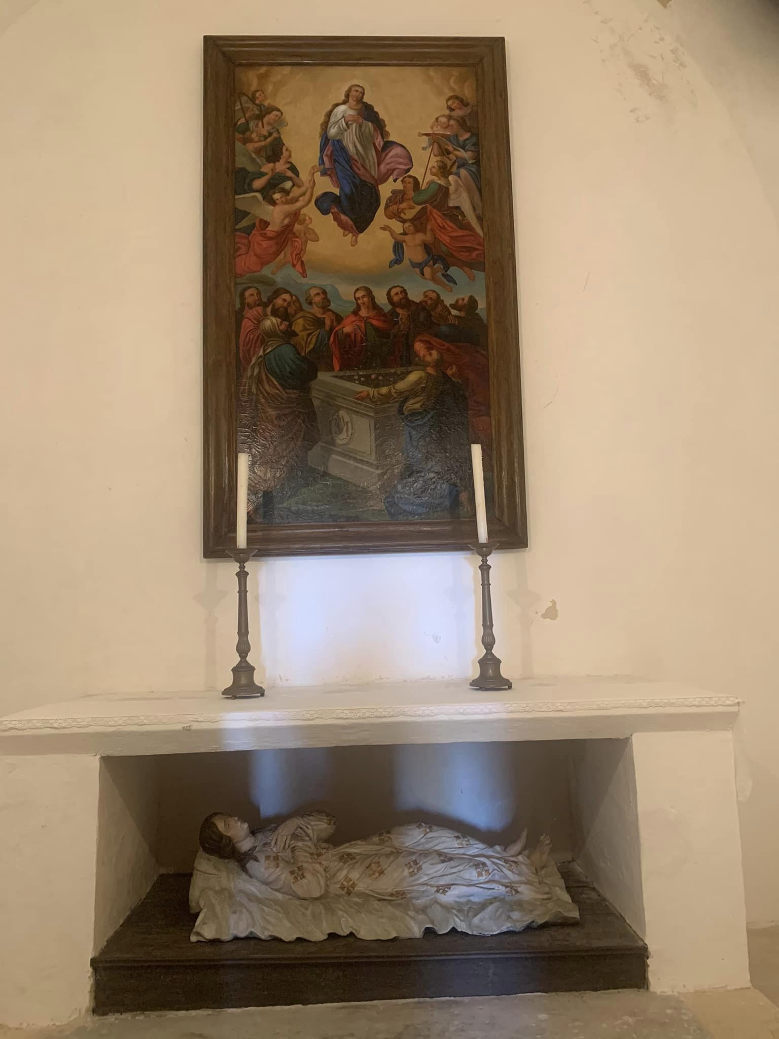 Der zweite Raum birgt unter der Altarmensa das Grab Mariens. Die Figur ist genauso geschnitzt und bemalt wie jene aus dem Trauerzug.