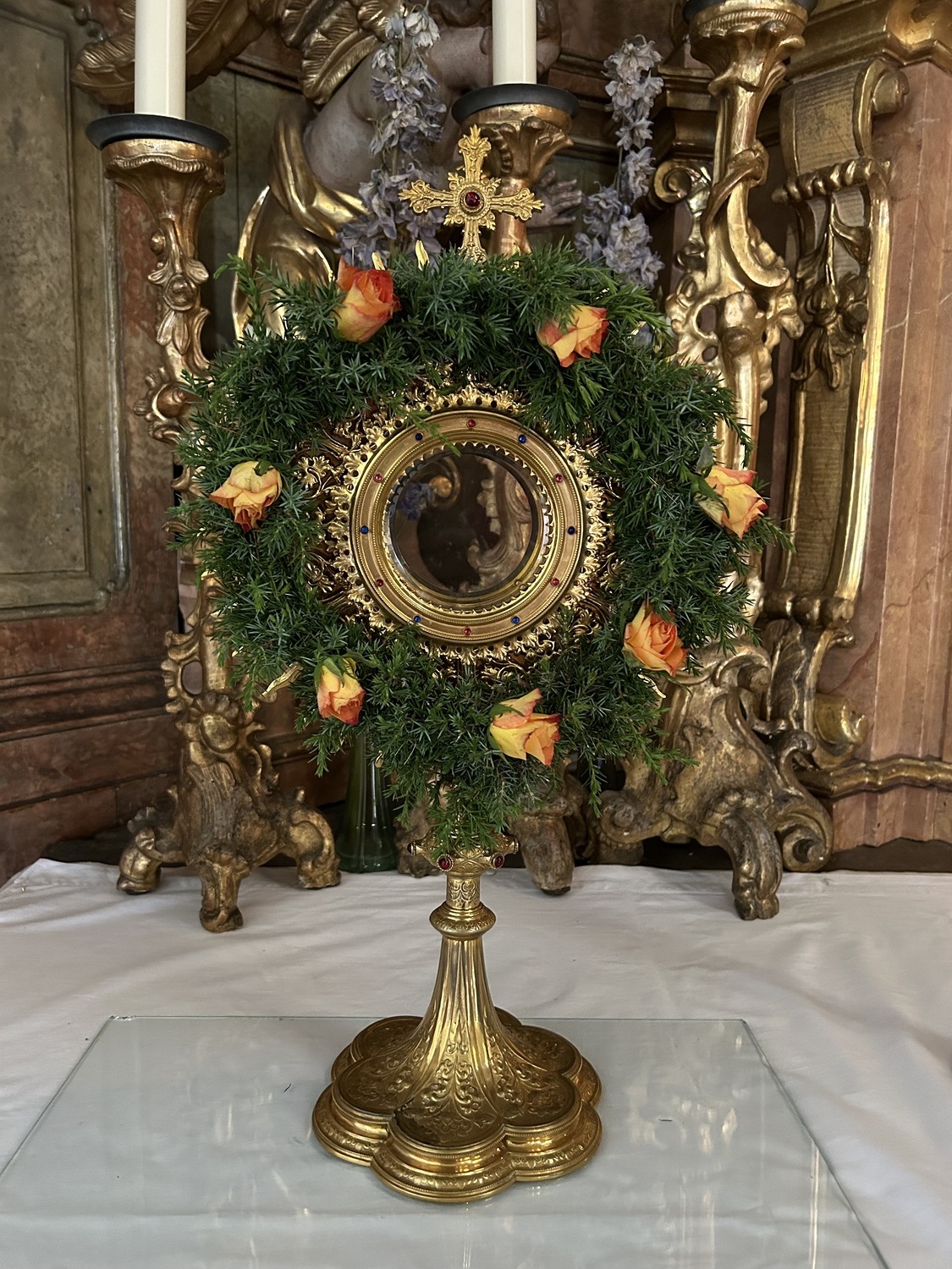 Das Ausschwenken zu den Gästen vom Café um auch ihnen den Segen zu spenden ist jetzt im dritten Jahr unseres Pfarrers Alexander schon Routine, aber wenn man bei einem Haus vorbeikommt, wo zwischen zwei Vasen der Stoffesel von Missio steht, weiß man, dass dies die Bitte an ihn ist, mit der Monstranz ganz nahe zu kommen. Warum? Diesen Esel haben wir zu Ostern 2023 hergeschenkt. Hergeschenkt an eine alte Frau, welche seit Jahren bettlägerig ist und nur noch sich und ihre Stofftiere wahrnimmt, die sie pausenlos streichelt. Ihr betagter Mann und ihre Familie pflegen Sie zu Hause so gut es geht. So stand letztes Jahr hat unser Pfarrer festgestellt, dass wohl der Osteresel zum Streicheln fehlen würde. Dieser Esel hat uns heute zum Fenster gelockt, Pfarrer Alexander hat den Segen gespendet, der Ehemann der Frau hat zu weinen begonnen und sich bedankt und die ganze Familie ebenso …