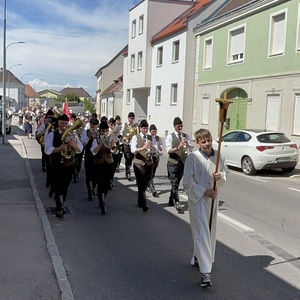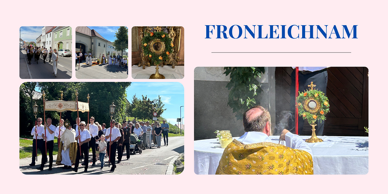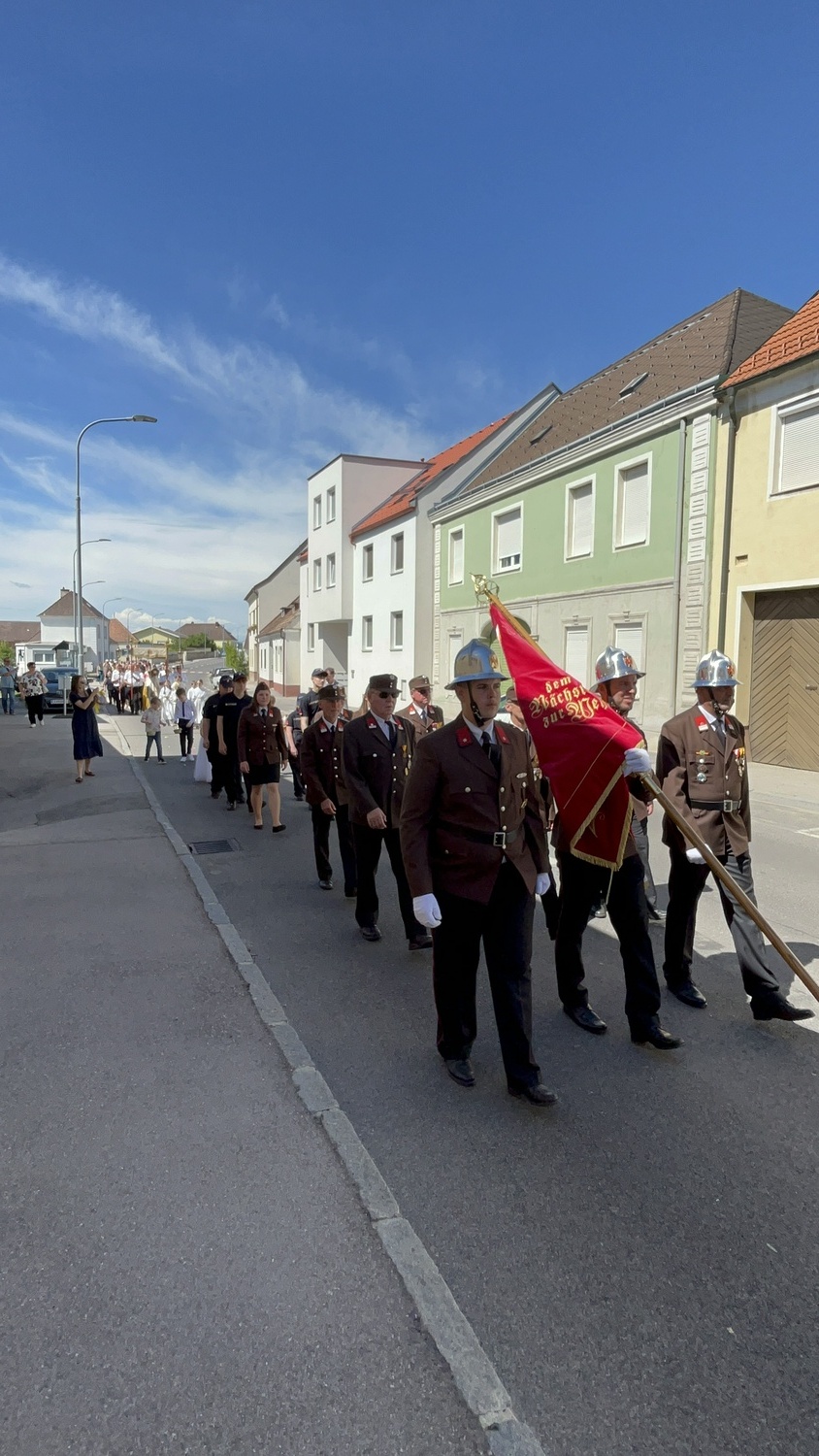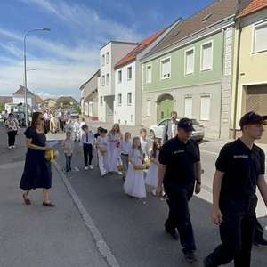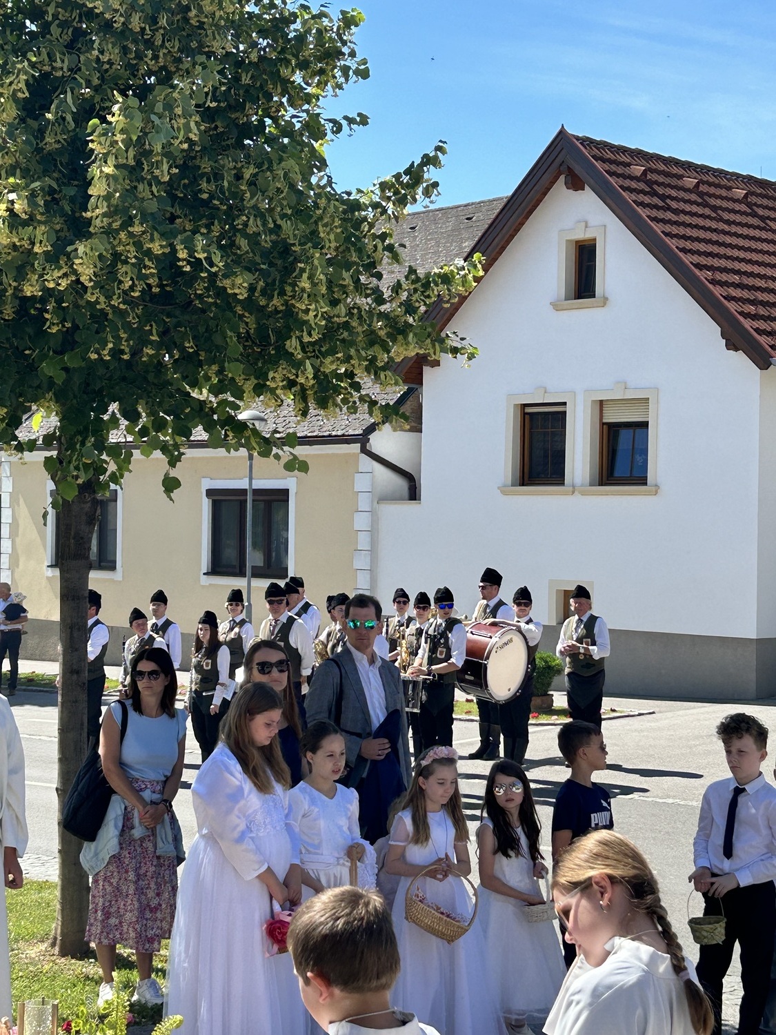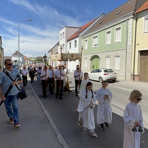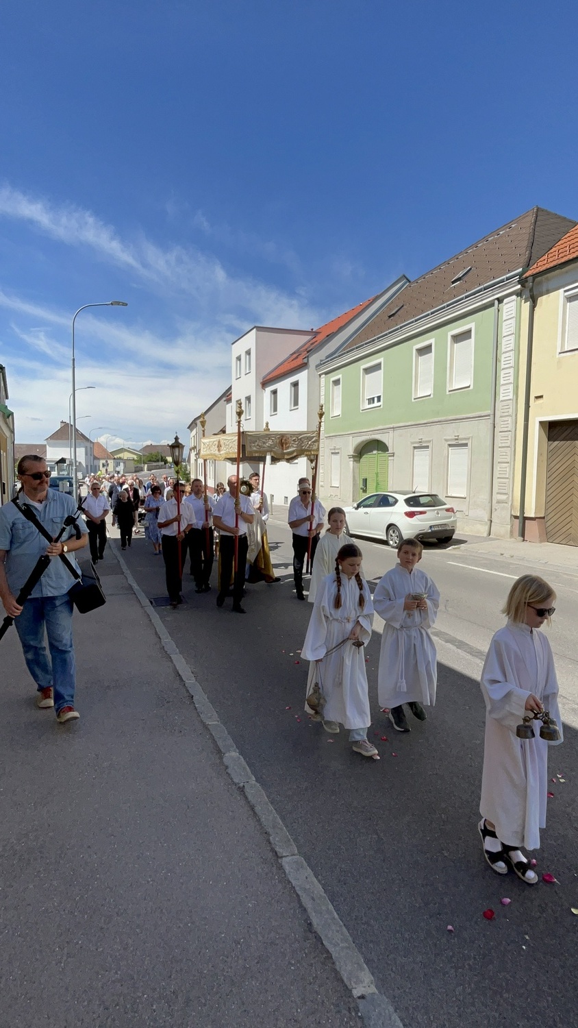 Heute waren wieder die Häuser, Straßen und Plätze im Dorf in der Stadt geschmückt. Nach der Hl. Messe in der Pfarrkirche wurde die Prozession zu den 4 Altären im Dorf von der Winzerkapelle Kleinhöflein, der Freiwilligen Feuerwehr, den Sänger:innen , den Erstkommunionskindern von Kleinhöflein, sowie zahlreichen Kindern und Gläubigen begleitet. Alles zur Ehre Gottes, den wir in Form der Hostie durch unser Dorf trugen.