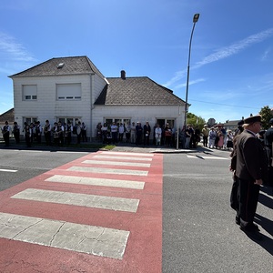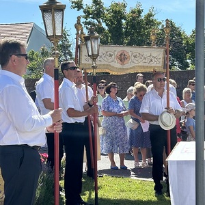 Schließlich gehen wir noch mit unserer Prozession am Haus eines Kameraden unseres Pfarrers vorbei, seine Frau sieht nicht mehr gut, ihm ist es gesundheitlich auch schon einmal besser gegangen. Seine Frau kommt vor die Türe. Wir halten an und auch hier wird der Segen gespendet.