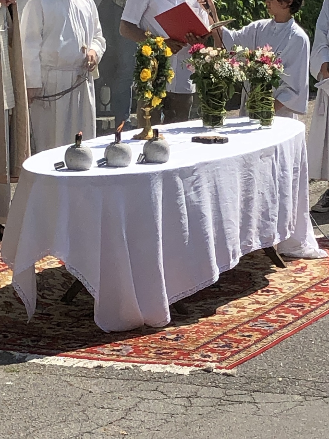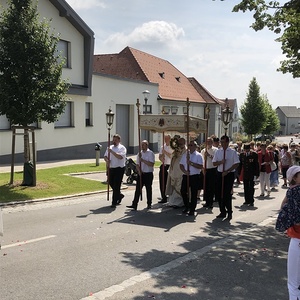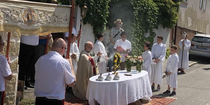 Zu Fronleichnam bezeugen wir unseren Glauben and die leibliche Gegenwart Jesu Christi im Saktrement der Eucharistie. Der Name des Festes leitet sich aus dem Mittelhochdeutschen "vrone licham" - Leib des Herren ab. Das Brauchtum der Fromleichnamsprozession, bei der der Leib Christi in einer Monstranz durch die Straßen getragen wird, stammt aus dem Mittelalter. Dabei werden auch der Flurschutz, Feldweihen und Wetterbitten dargebracht. Bei der Prozession nahmen traditionell Feuerwehr und Musikverein, sowie die Erstkommunionskinder und viele Gläubige teil.