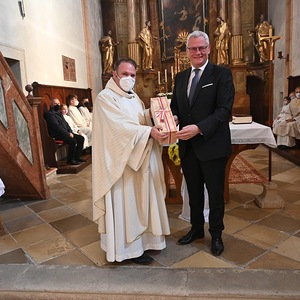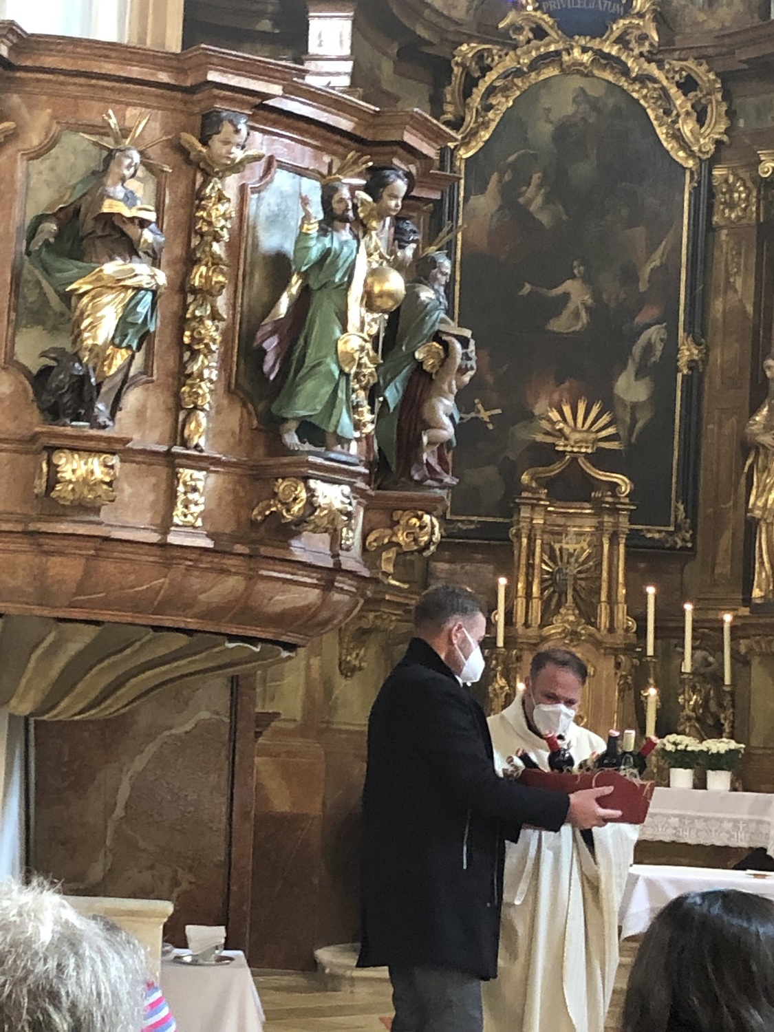 "Pfarrer" Alexander Wessely wurde neben Bürgermeister Thomas Steiner auch von Ratsvikarin Doris Fennes-Wager herzlich Willkommen geheißen und erhielt symbolisch die Schlüsses der Pfarrkirche Kleinhölfein, einen Weinkorb der Kleinhöfleiner Winzer und einen Allerheiligen Striezel.