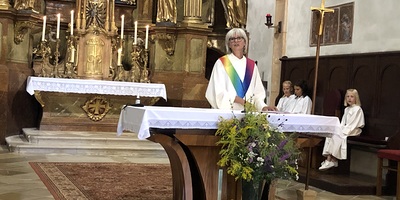 Beim heutigen Festgottesdienst wurde die restaurierte Dreifaltigkeitssäule von unserem Pfarrer Alexander Wessely gesegnet.