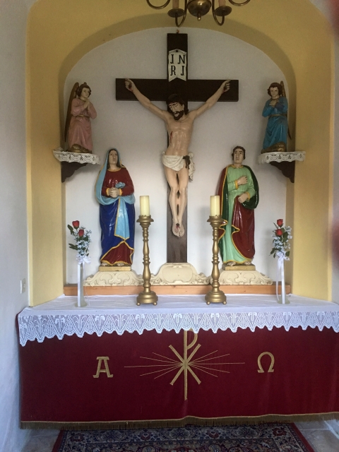 Im Inneren der Kapelle befindet sich ein Hochaltar mit einer Kreuzigungsgruppe.