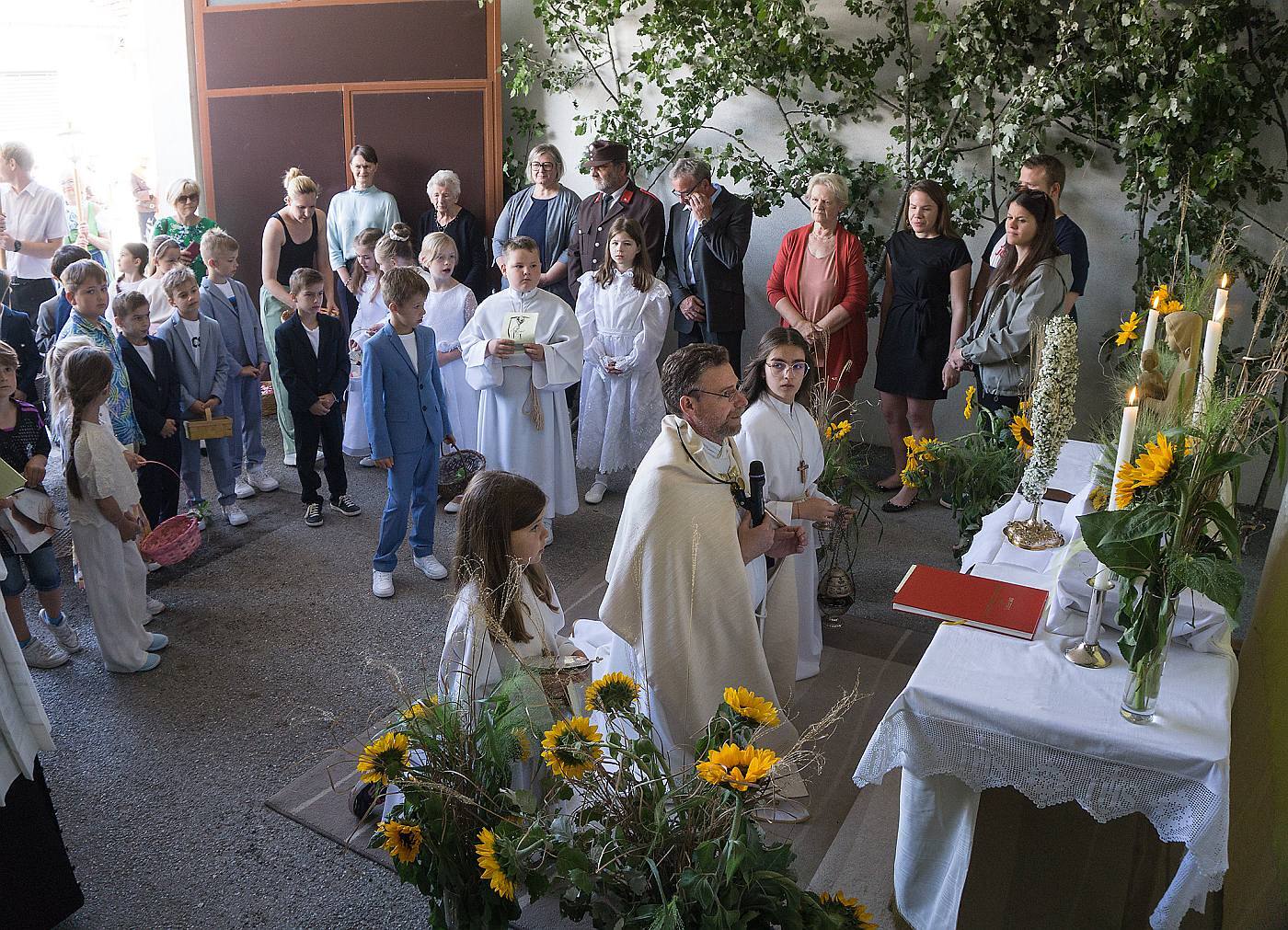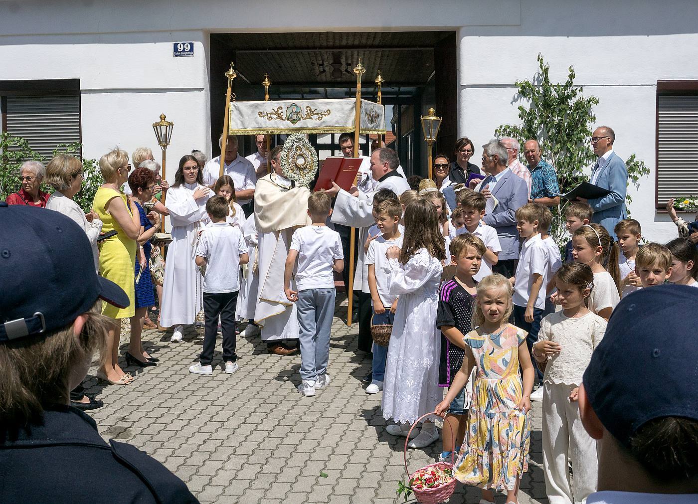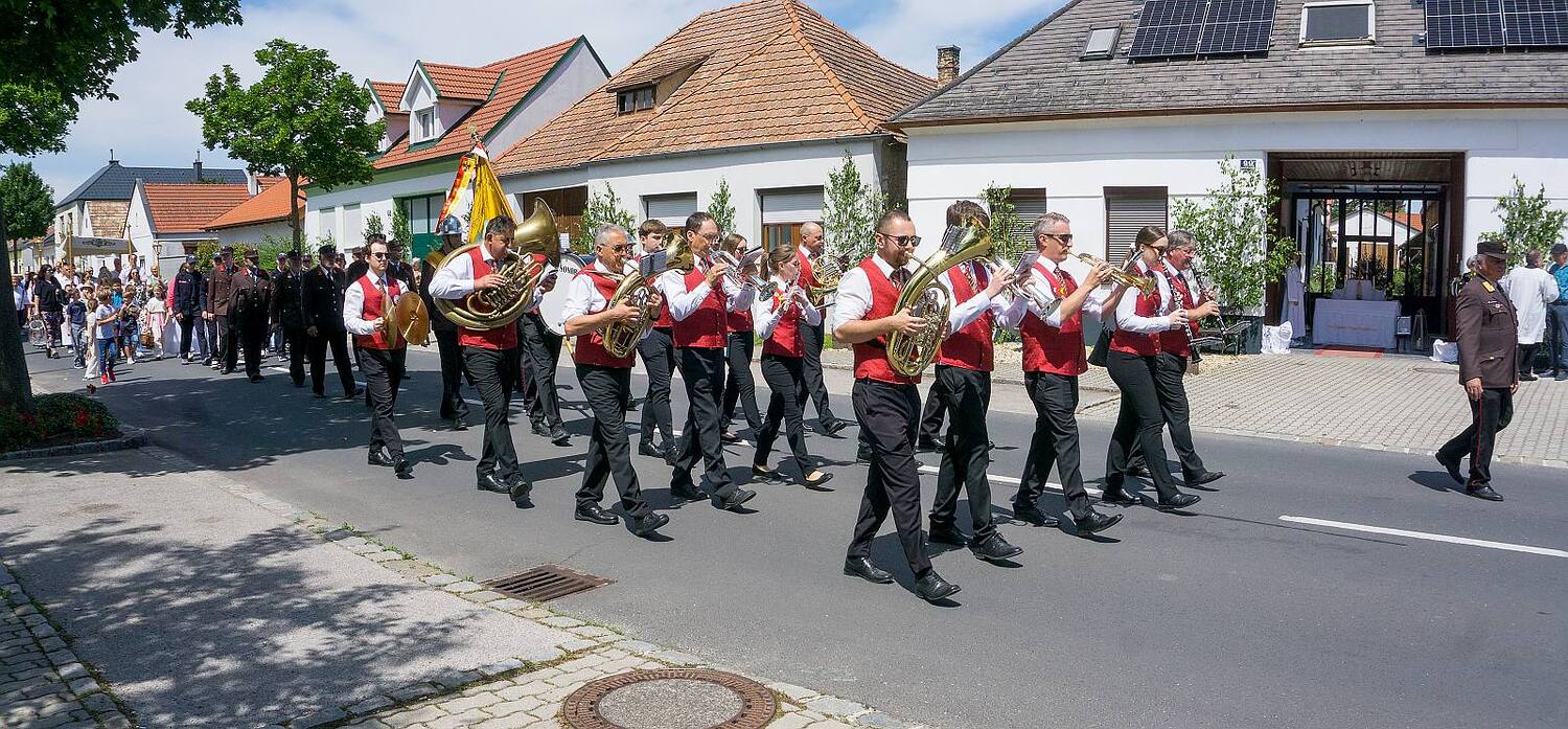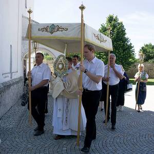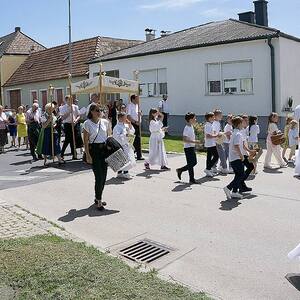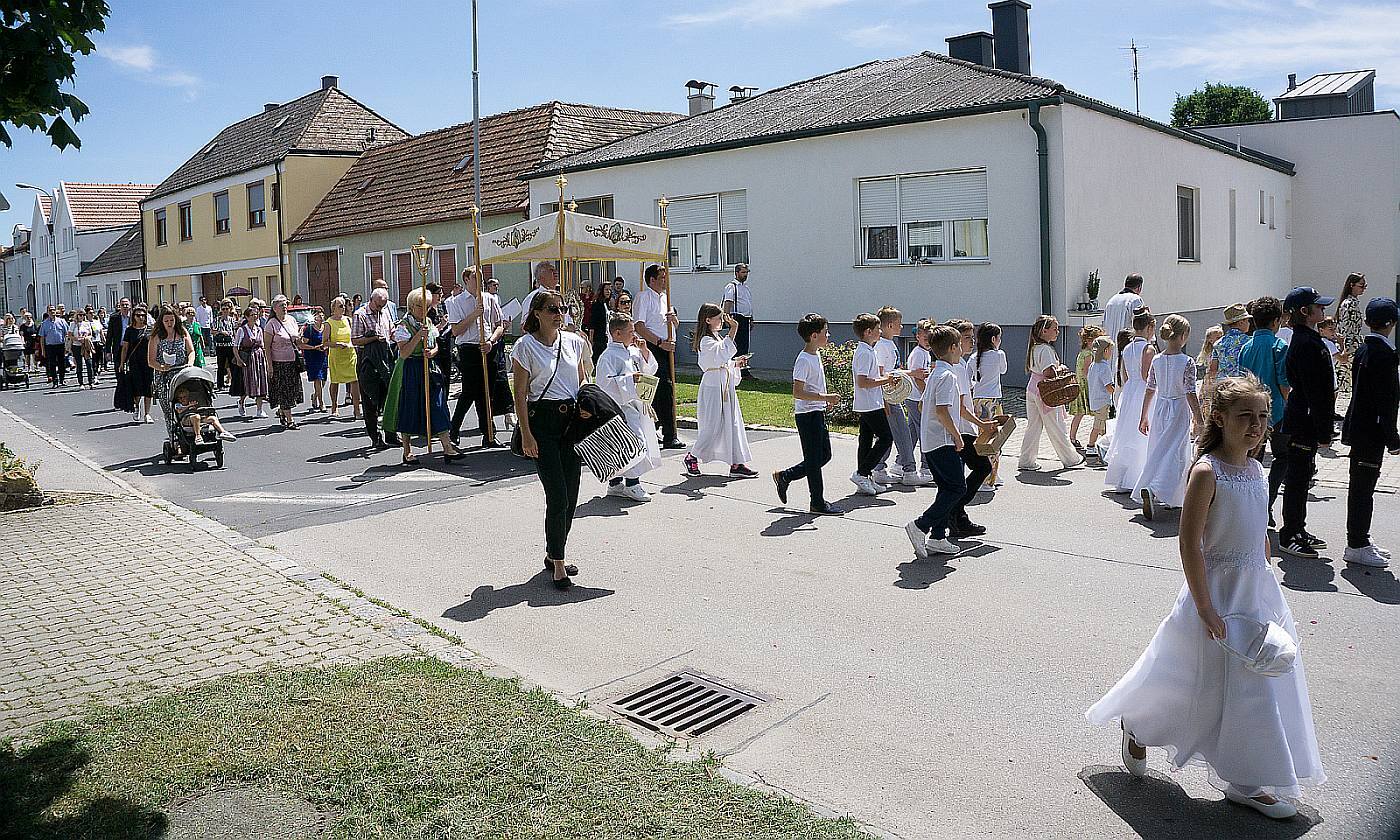 Fronleichnam fand heuer am 30. Mai 2024 statt. Nach der heiligen Messe führte eine Prozession auf der Hauptstrasse zu den vier Altären, Pfarrmoderator Jahns trug das Allerheiligste in der festlich geschmückten Monstranz, das von einem "Himmel" (Stoffbaldachin) beschirmt wurde. Die Prozession wurden von der Feuerwehr und dem Jungenblasmusikverein begleitet, die Erstkommunionkinder streuten Blumen vor dem Allerheiligsten. Früher war es üblich, entlang der Straße grüne Birken aufzustellen,