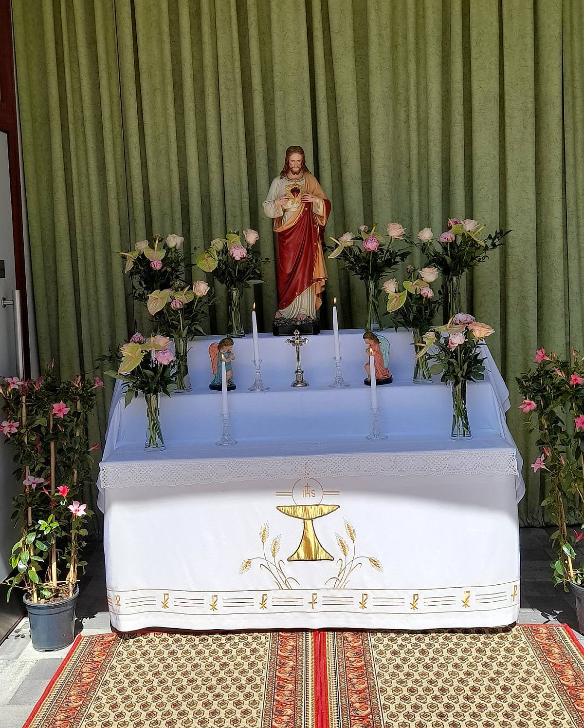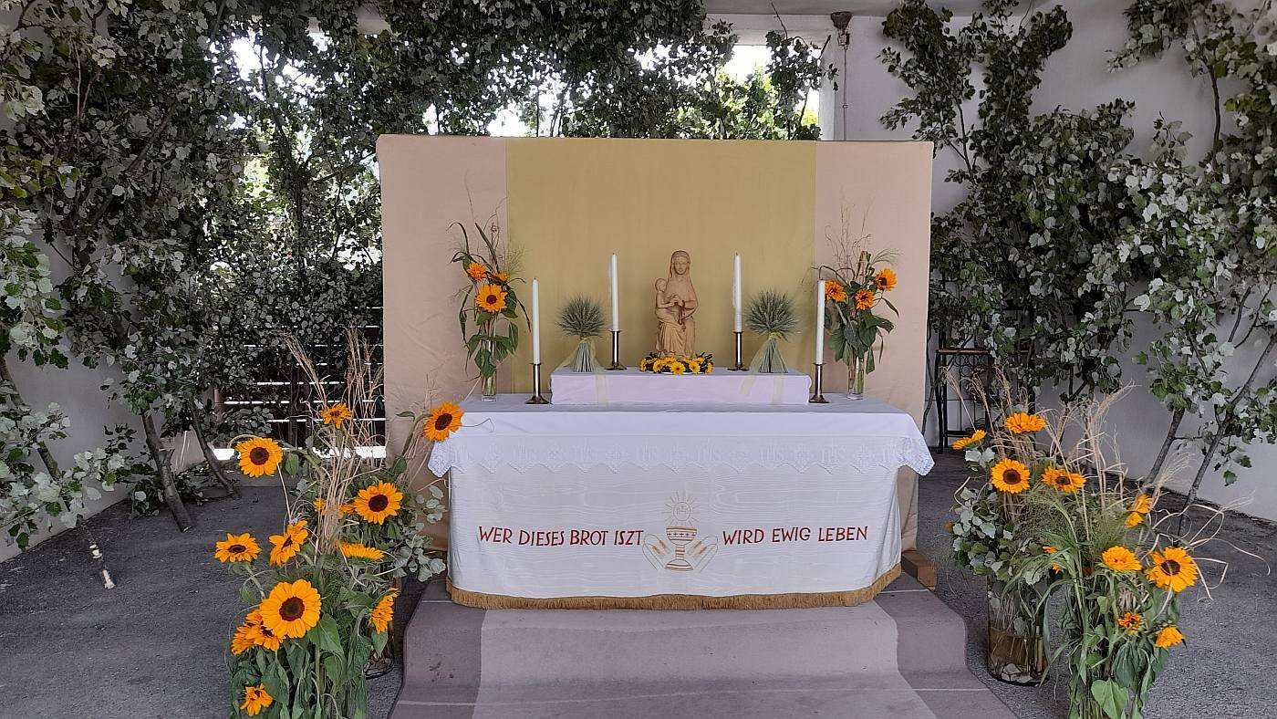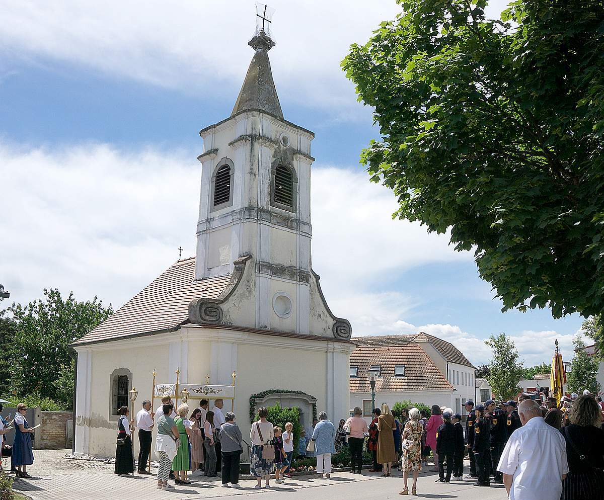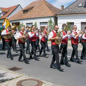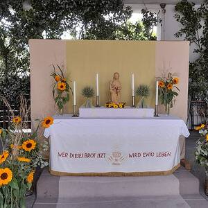 Fronleichnam fand heuer am 30. Mai 2024 statt. Nach der heiligen Messe führte eine Prozession auf der Hauptstrasse zu den vier Altären, Pfarrmoderator Jahns trug das Allerheiligste in der festlich geschmückten Monstranz, das von einem "Himmel" (Stoffbaldachin) beschirmt wurde. Die Prozession wurden von der Feuerwehr und dem Jungenblasmusikverein begleitet, die Erstkommunionkinder streuten Blumen vor dem Allerheiligsten. Früher war es üblich, entlang der Straße grüne Birken aufzustellen,