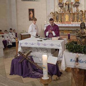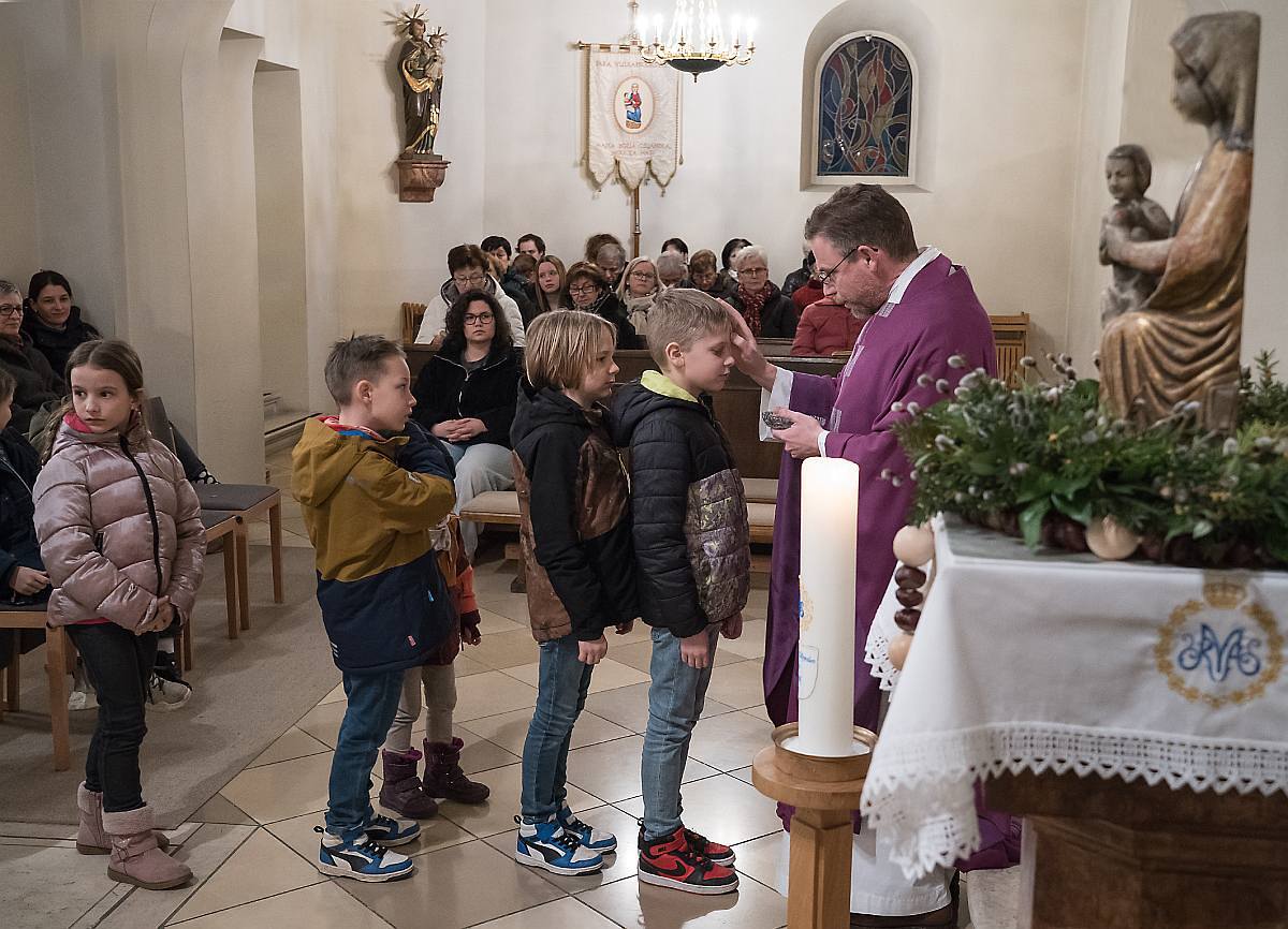 Pfarrmoderator Jahns feierte am 4.3.2025 den Aschermittwoch, den Beginn der 40-tägigen Bußzeit, in einer vollen Kirche. Viele Gläubige waren gekommen, um das Aschenkreuz zu empfangen. Die Asche für die Spendung des Aschenkreuzes wird aus den verbrannten Palmzweigen des Vorjahres bereitet und vom Priester gesegnet. Pfarrmoderator Jahns hat dieses Jahr mit den Volksschulkindern diese Asche gemacht.