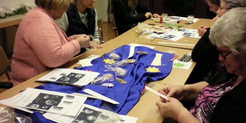 Unter der Leitung von Eveline Scheiber und Christa Frauenschiel versuchten sich die Frauen in der alten Technik der Zick-Zack Faltung und Gestaltung von Solino-Sternen. Mit einer spitzen Schere wurden verschieden Muster ins Papier geschnitten um am Ende stilvolle Sterne entstehen zu lassen. Diese Aufgabe war gar nicht so einfach, es sind dennoch in mühevoller Arbeit und mit viel Engagement wunderschöne Sterne entstanden.