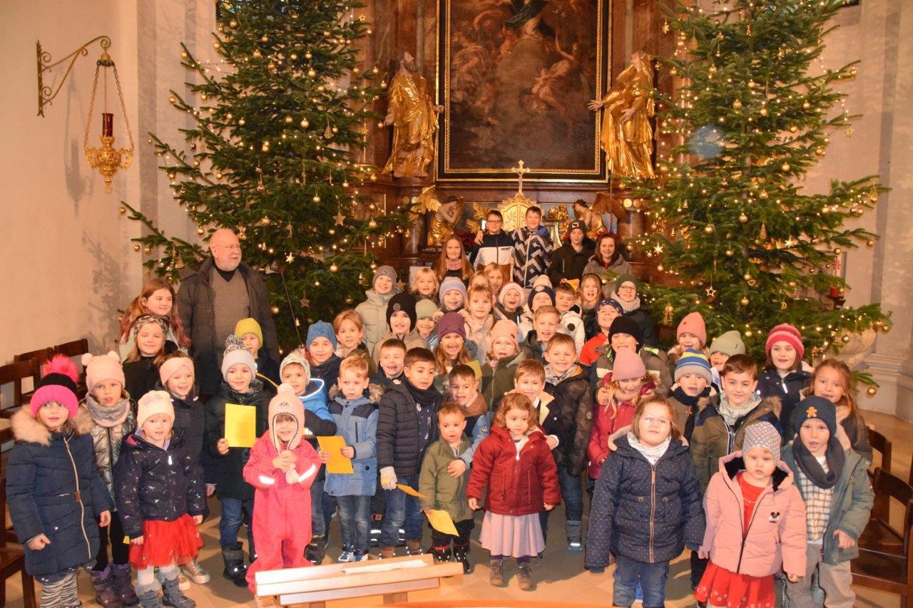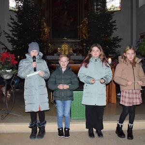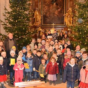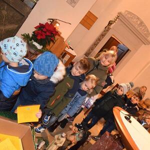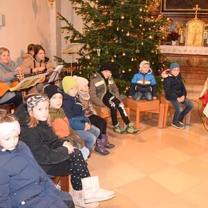 Im Kinderwortgottesdienst am Heiligen Abend feierten wieder sehr viele Kinder mit ihren Familien die Geburt von Jesus. Es wurden die Kerzen am Adventkranz noch einmal entzüdet. Im Evangelium erzählte uns Hr. Pfarrer Giefing die Weihnachtsgeschichte und ein großes Paket vor der Krippe machte alle neugierig. Was da wohl drinnen war? Jesus schenkt sich uns durch seine Geburt. Als Erinnerung daran, durfte sich jedes Kind einen Leuchtstern aus dem großen Paket mit nach Hause nehmen. Zum Schluss sangen alle gemeinsam "Stille Nacht" begleitet von Cosima Maier auf der Orgel.