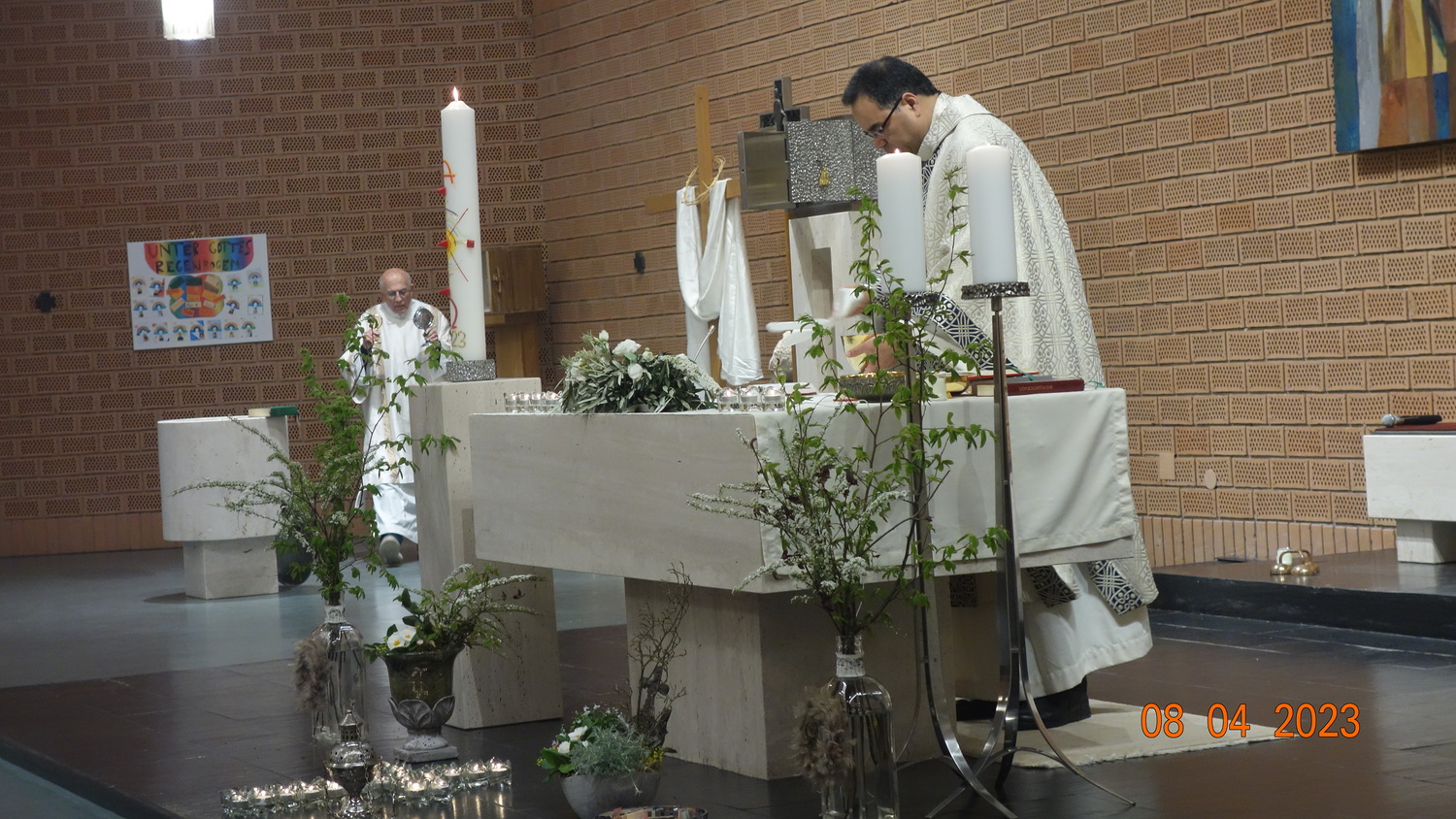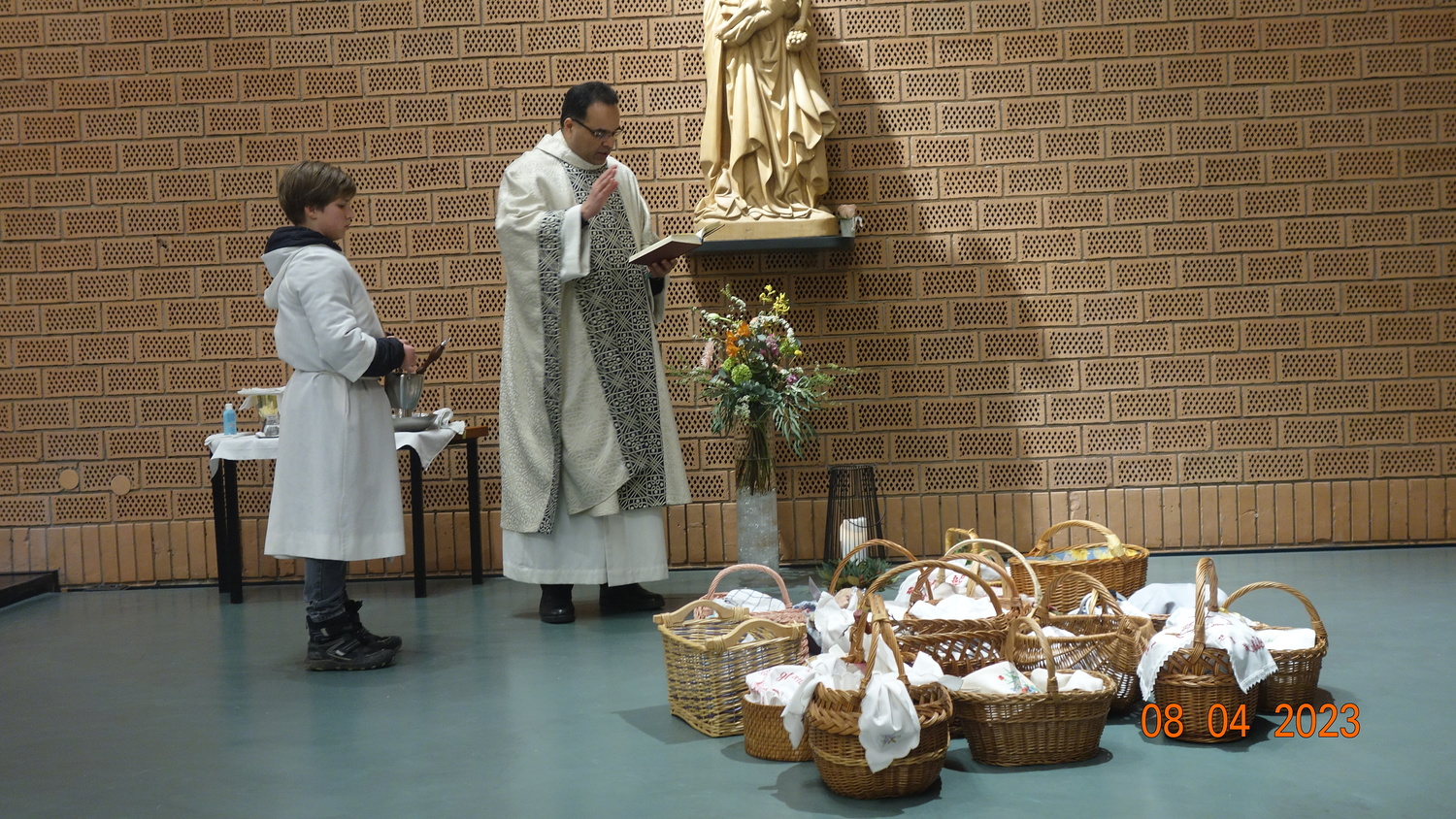 Schlussendlich wurden noch die mitgebrachten Speisen gesegnet. Am Kirchausgang verteilten Pater Kuruvila und Diakon Dr. Peter Zotti die Blumen von der Kreuzverehrung vom Freitag und wünschten jedem Gläubigen bei Verlassen der Kirche:"Frohe Ostern!"