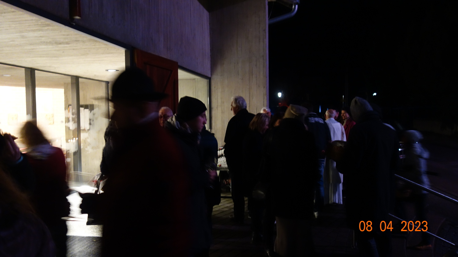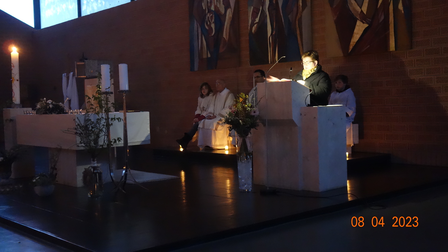 Es war schon sehr stimmungsvoll, als mit dem Gesang "Lumen Christi" (Christus das Licht), der Einzug in die total dunkle Kirche erfolgte. Als nächstes wurde das Licht der Osterkerze an die Gläubigen weitergegeben, die daran ihre mitgebrachten Kerzen entzündeten.