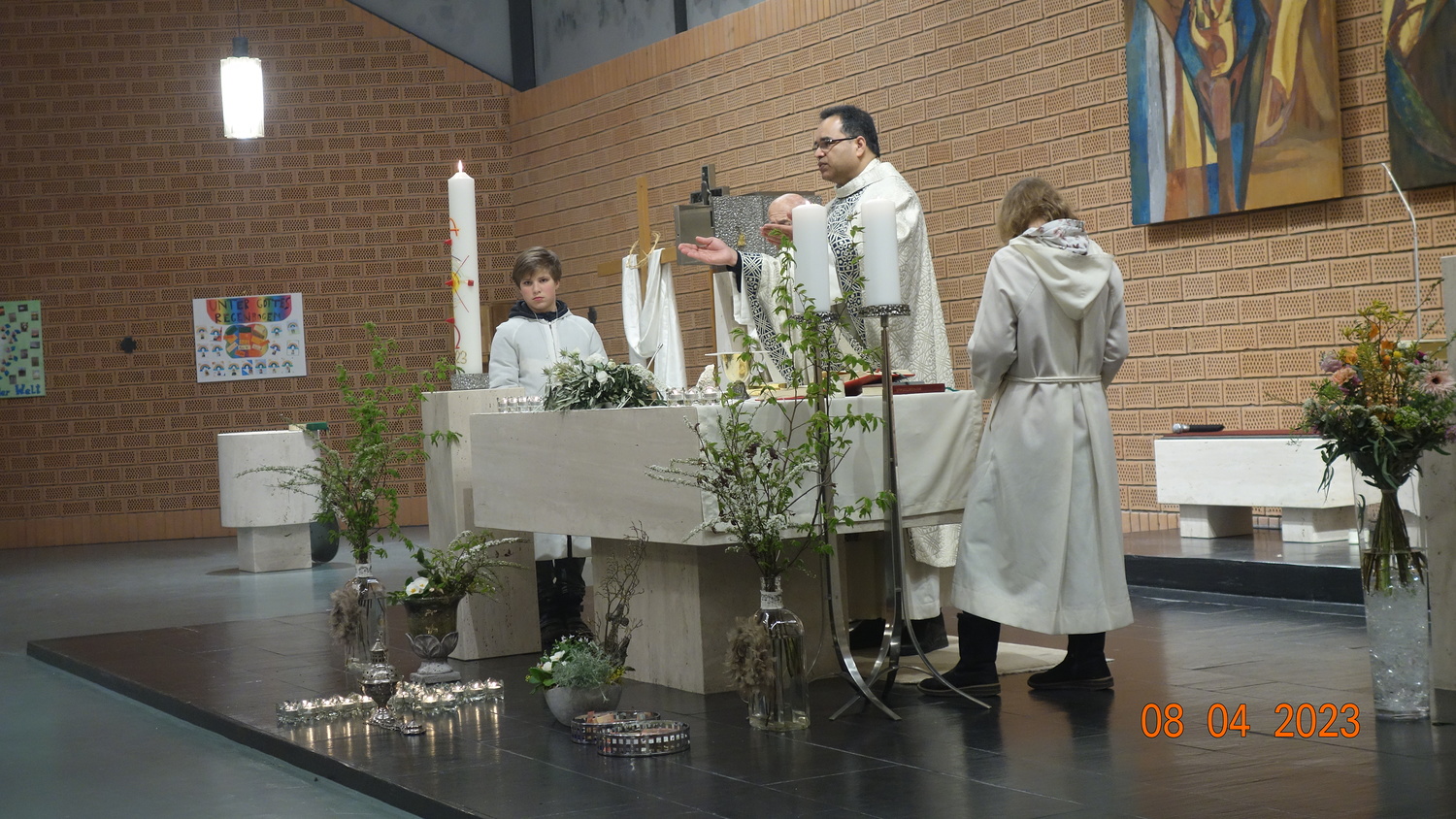 Besonders eindrucksvoll war dann das Gloria, mit dem wunderbaren Lied aus der Schubertmesse, das freudige Geläut der Glocken und die Rückkehr des Lichtes in die Kirche. Auch die Taufwasserweihe, wie die Erneuerung des Taufversprechens war sehr stimmungsvoll und trug zum besonderen Ambiente der Feier bei.