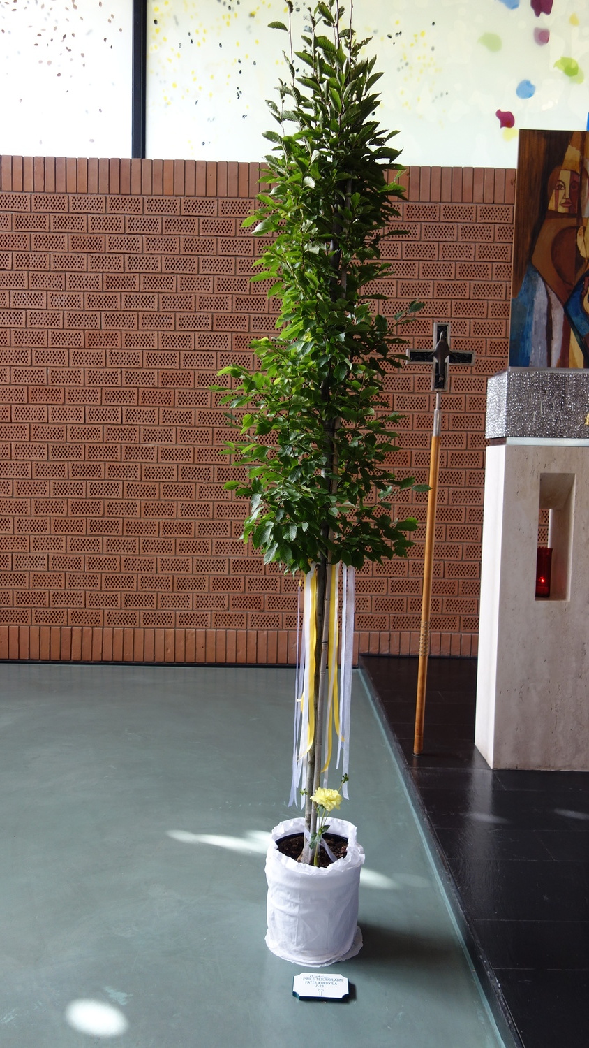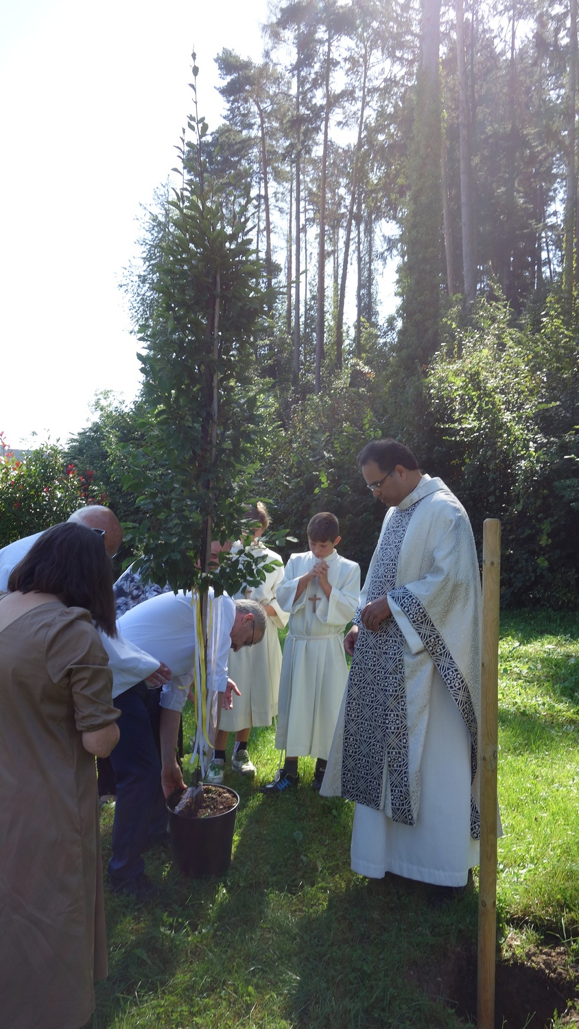 Nach der Hl. Messe pflanzte Pater Kuruvila einen Baum, eine Säulenhainbuche, im Bereich des Kirchengrundes, hinter der Pfarrkirche.