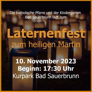 Die Pfarre Bad Sauerbrunn und der Kindergarten feierten auch heuer wieder in einer gemeinsamen Veranstaltung, dem Laternenfest, den burgenländischen Landespatron, den Hl. Martin. Das Laternenfest fand am 10. November, ab 1730 Uhr im Kurpark Bad Sauerbrunn statt.