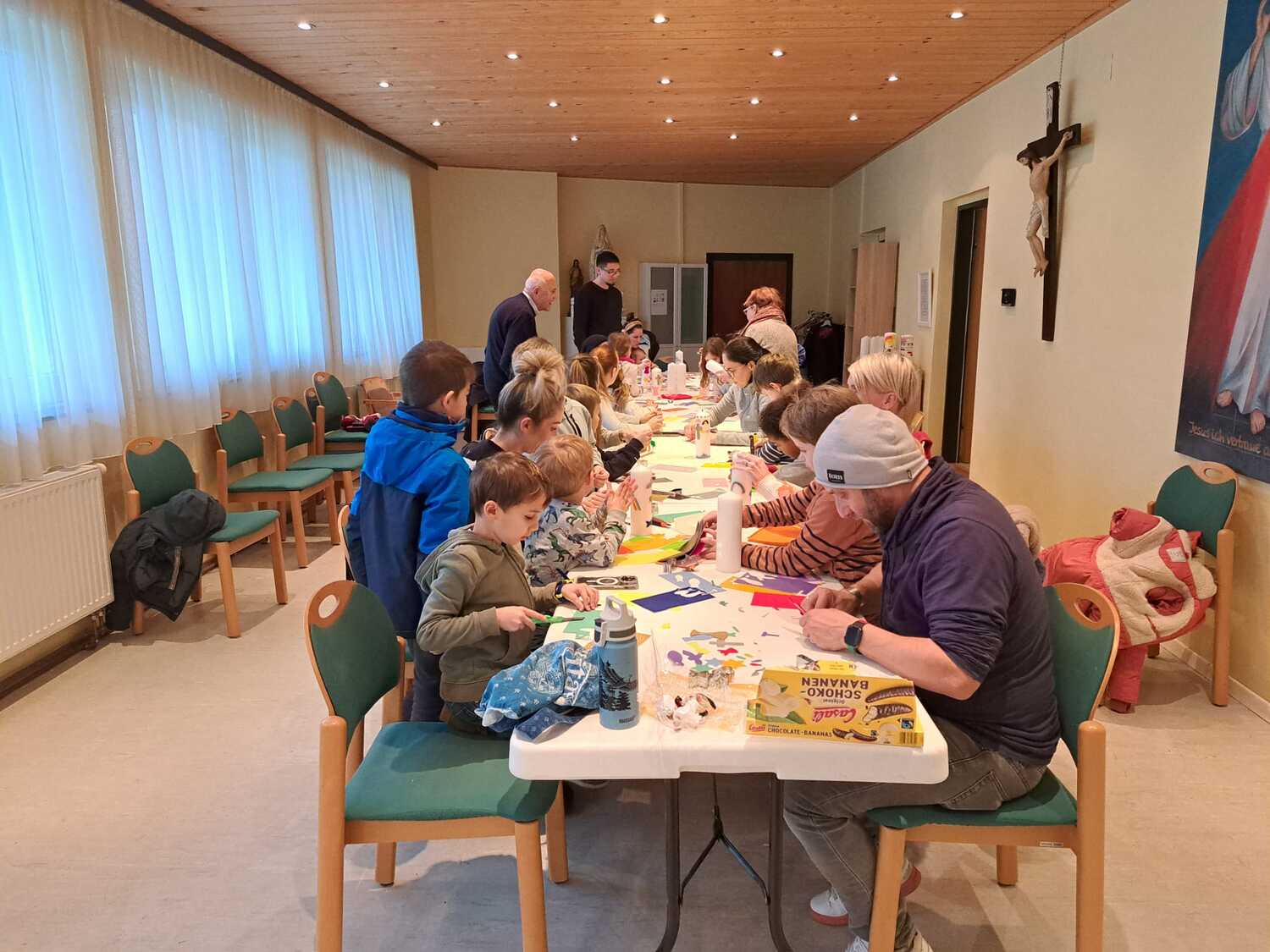 Die Erstkommunionkinder mit ihren Eltern beim gestalten