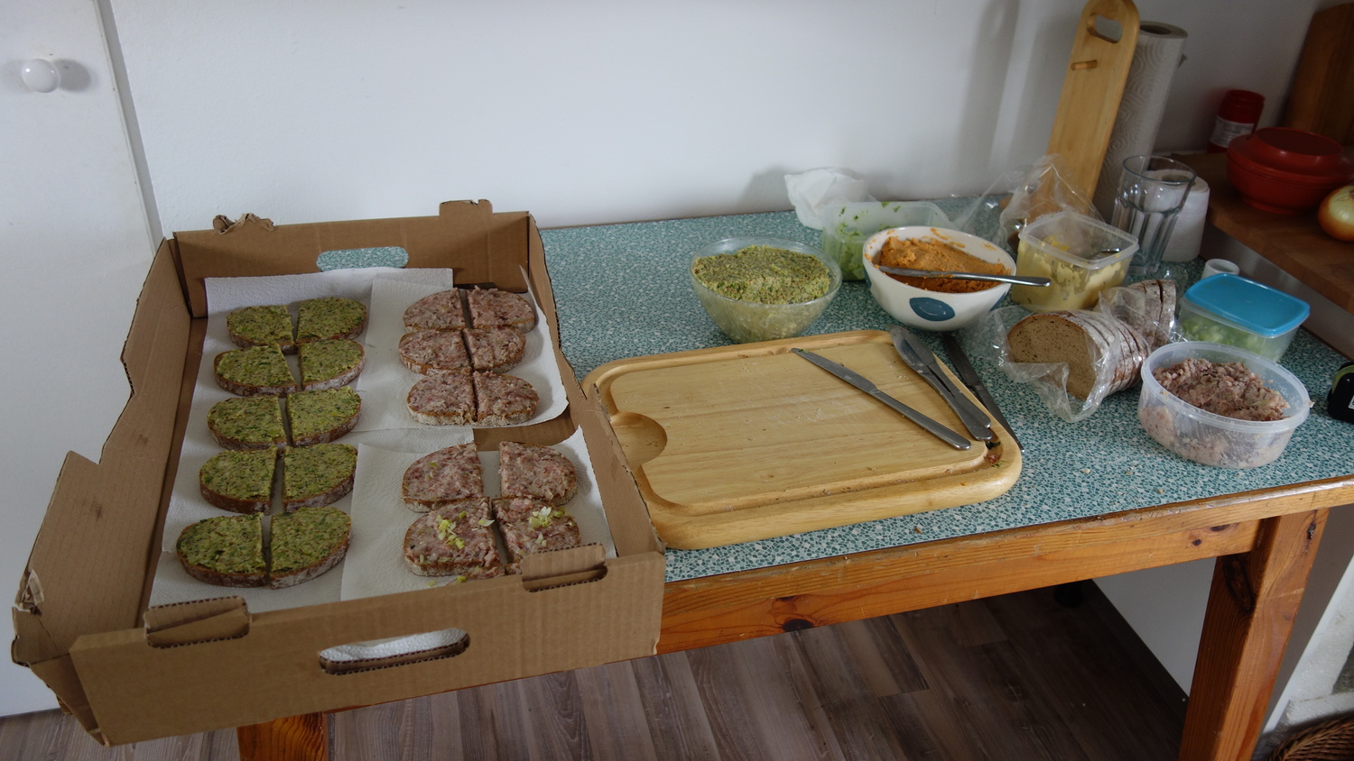 Es gab gute Brote mit Aufstrich zu essen, Osterstriezel, Ostereier und Schoko- Eier. Es wurde aber auch Wein gereicht und alkoholfreie Getränke.