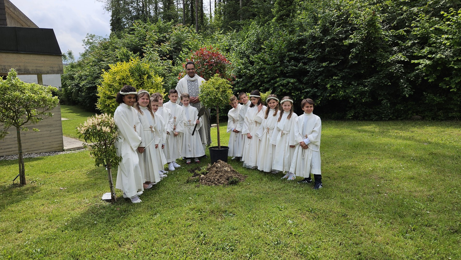Bereits seit mehreren Jahren ist es üblich, dass der Jahrgang der Erskommunionskinder nach der Erstkommunionsfeier, in der Wiese rechts der Kirche einen Baum pflanzt. So ist bereits ein schöner Hain der "Jahrgangsbäume" entstanden. Auch die Erstkommunionkinder des Jahrganges 2024 setzten diese Tradition fort und pflanzten mit Pater Kuruvila einen Baum.