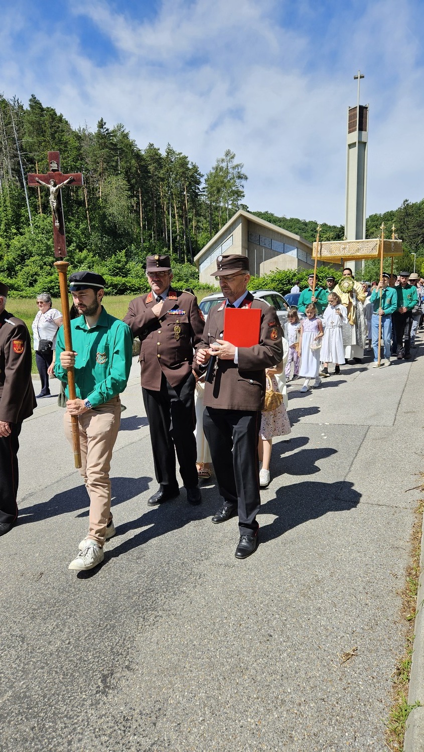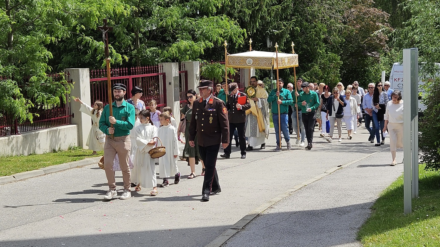 Dankenswerterweise hatten sich die Vereine des Ortes an der Prozession beteiligt. So sorgte die Freiwillige Feuerwehr Bad Sauerbrunn für die Spitze und Verkehrsregelung und der 1.unpolitische Burschenverein trug den Himmel, Kerzen und dergleichen.