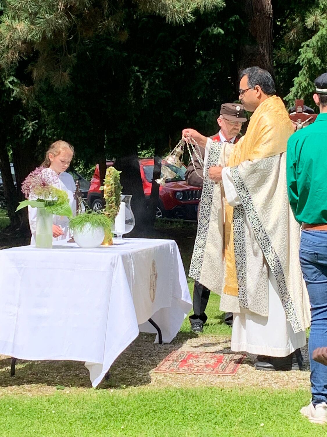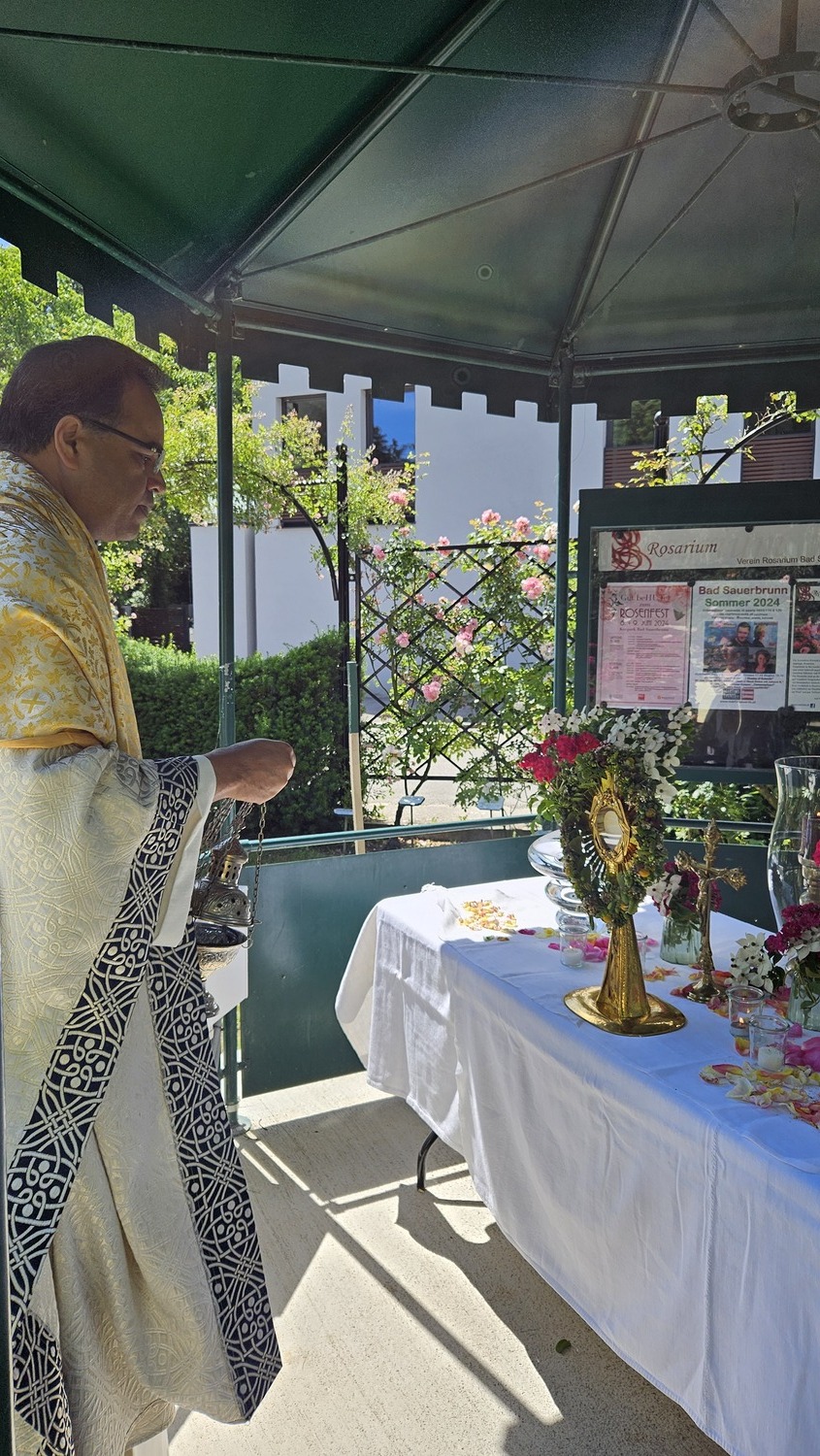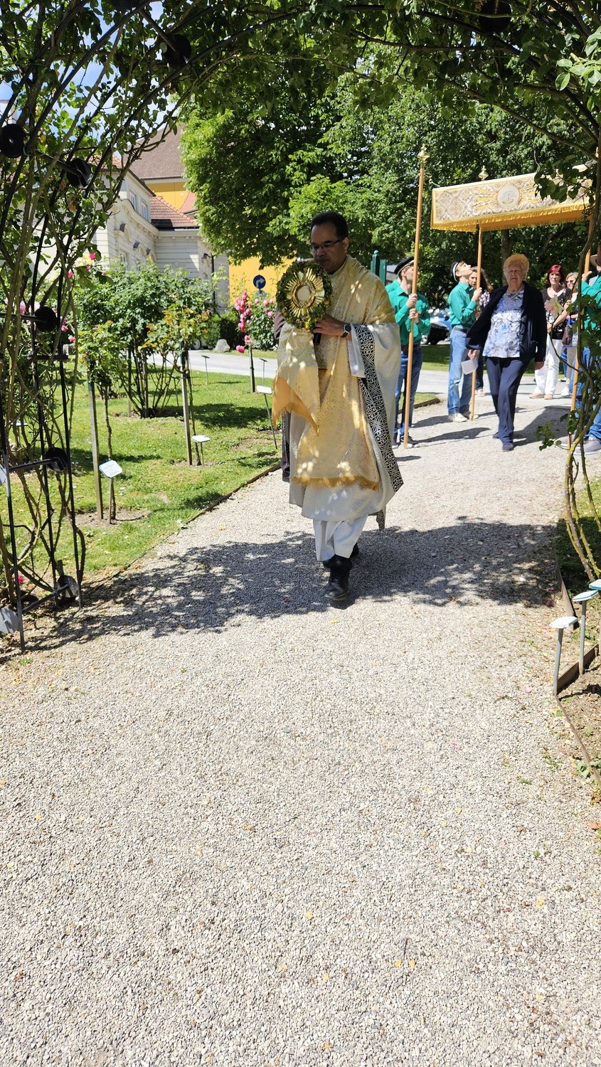 Für den 30. Mai, Fronleichnam, hatte die Pfarre Bad Sauerbrunn um 10 Uhr in die Pfarrkirche zur Hl. Messe und zur Fronleichnamsprozession eingeladen. Es waren sehr viele Gläubige der Pfarrgemeinde Bad Sauerbrunn und Gäste in die Kirche gekommen um Fronleichnam zu feiern. Auch eine Abordnung der Freiwillgen Feuerwehr von Bad Sauerbrunn und des Burchenvereines, konnte Pater Kuruvila zur Hl. Messe begrüßen.