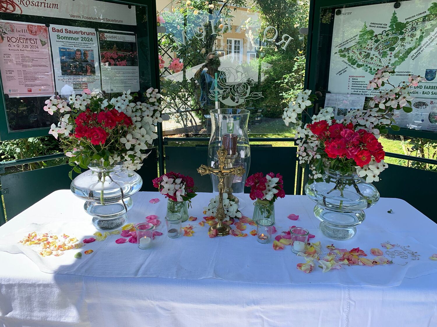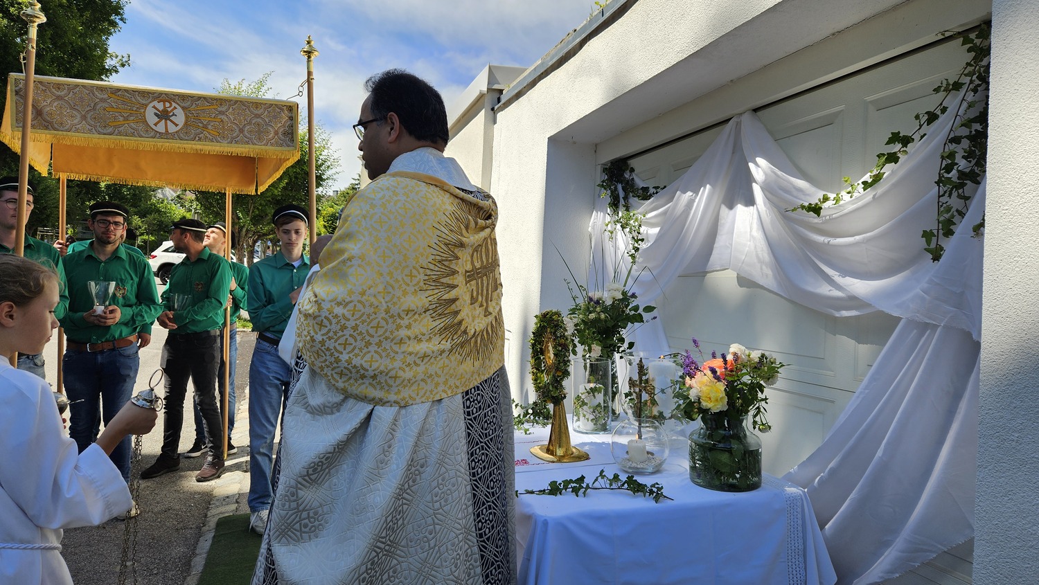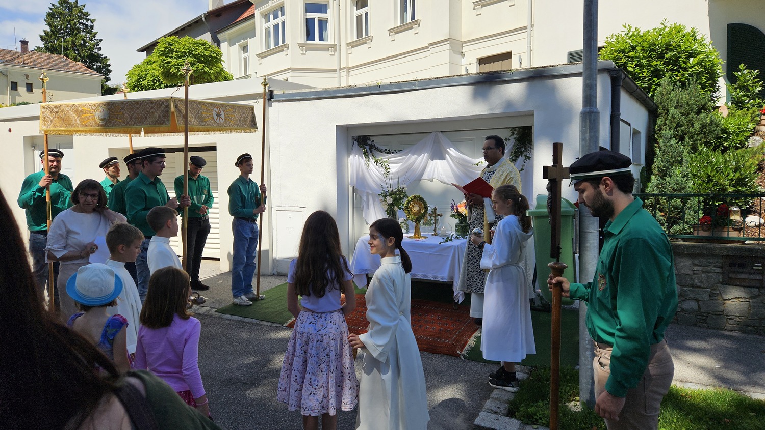 Geschmückte Altäre an denen die Prozession vorbeiführte und wo die liturgischen Gebete, Evangelien, Fürbitten und Texte vorgetragen wurden, waren in der Schulgasse, im Rosarium und im Pavillon in der Kirchengasse errichtet. Zum Ende der Prozession und der Hl. Messe zu Fronleichnam gings wieder in die Pfarrkirche.