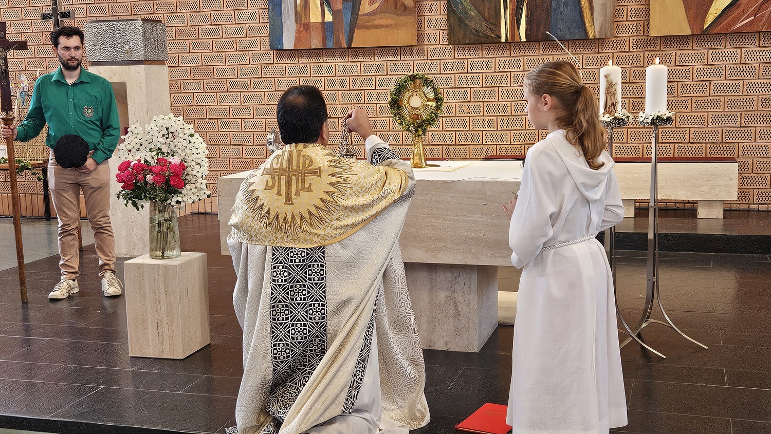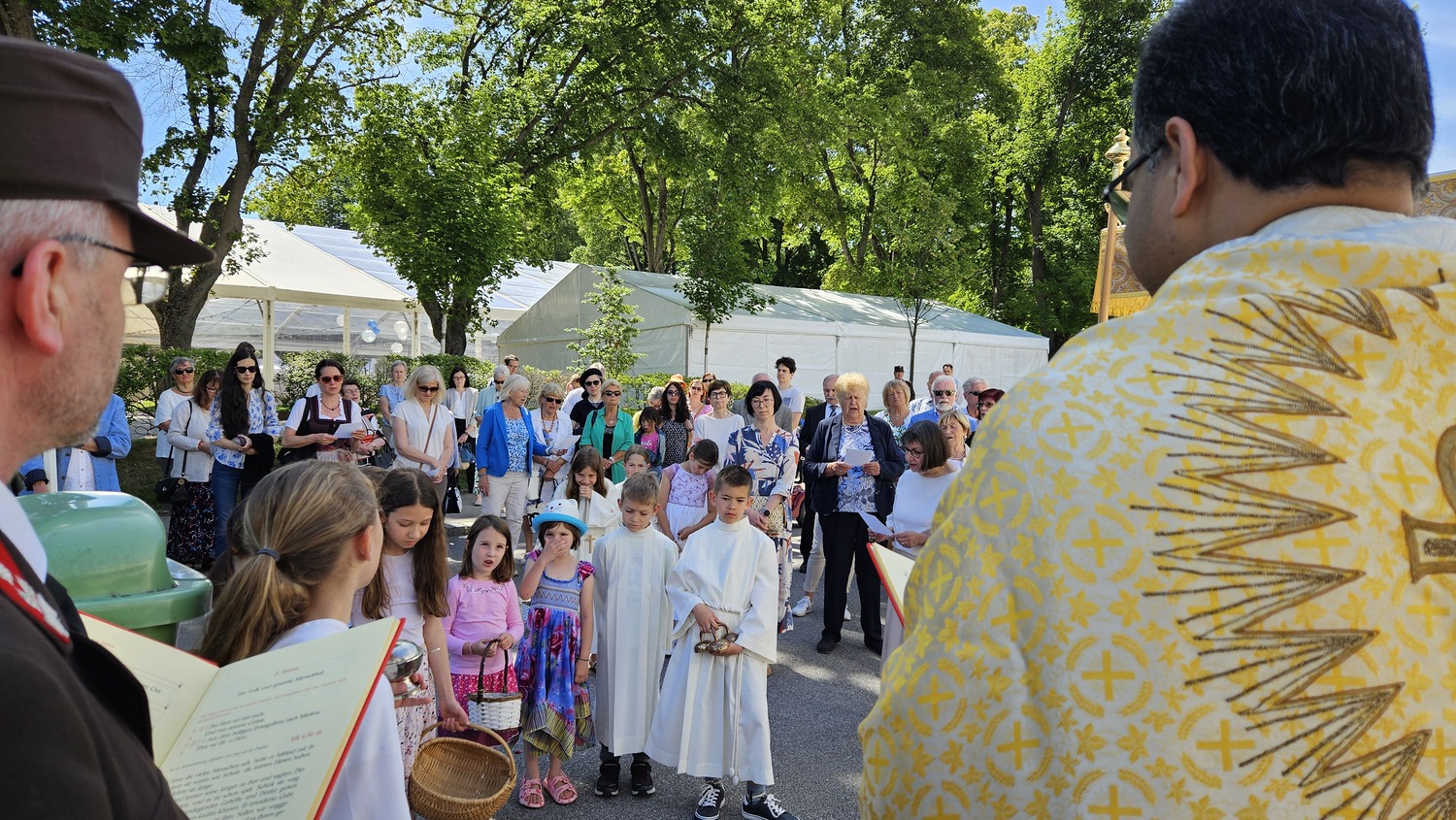 Die Erstkommunionkinder, die vorige Woche ihre Hl. Erstkommunion hatten, nahmen auch sehr engagiert an der Prozession teil und streuten, einer alten Tradition folgend, Blumenblütenblätter auf den Prozessionsweg.