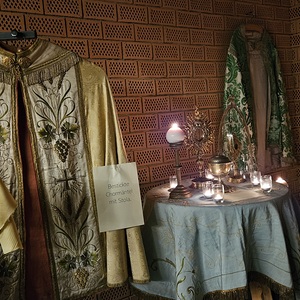 Die Besucher wurden über die Exponate mit beigefügten Texten informiert. So wurden auch unter anderem Kelche, Monstranzen, Kerzenleuchter und andere Gegenstände aus dem Fundus der alten Kirche von Bad Sauerbrunn gezeigt und auch sehr wertvolle Chormäntel und Messgewänder. Geordnet waren die Meßgewänder nach Liturgiefarben und mit beigefügten Texten, wurde die Bedeutung der Liturgiefarben erklärt.