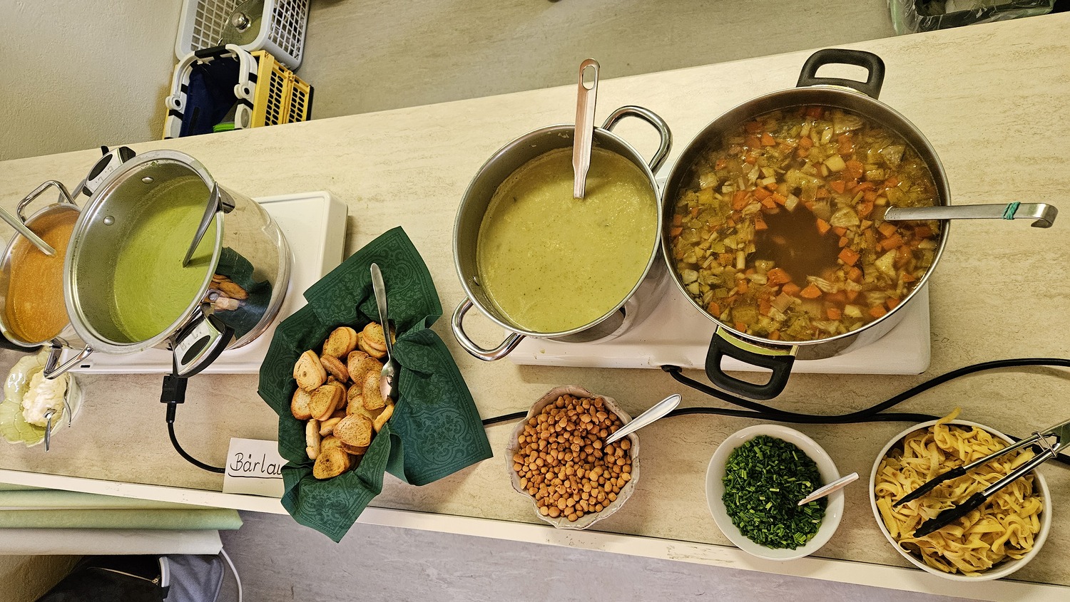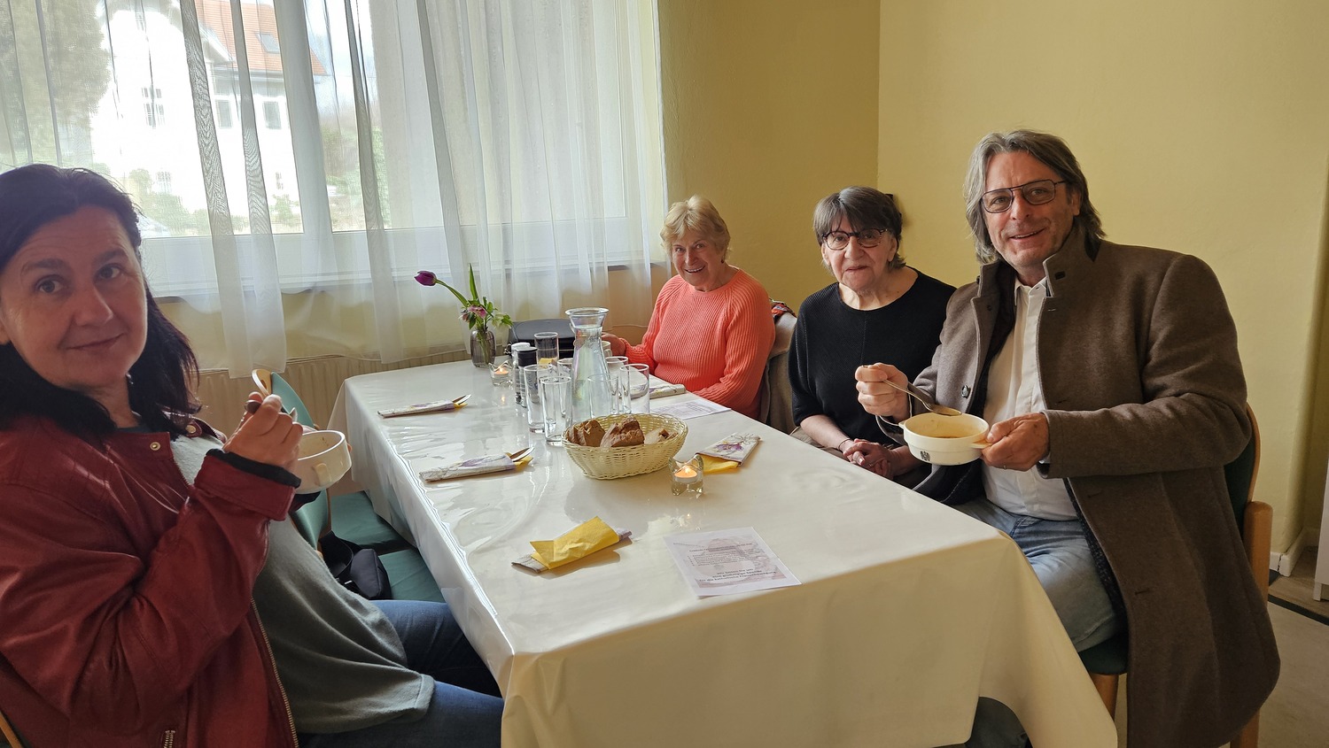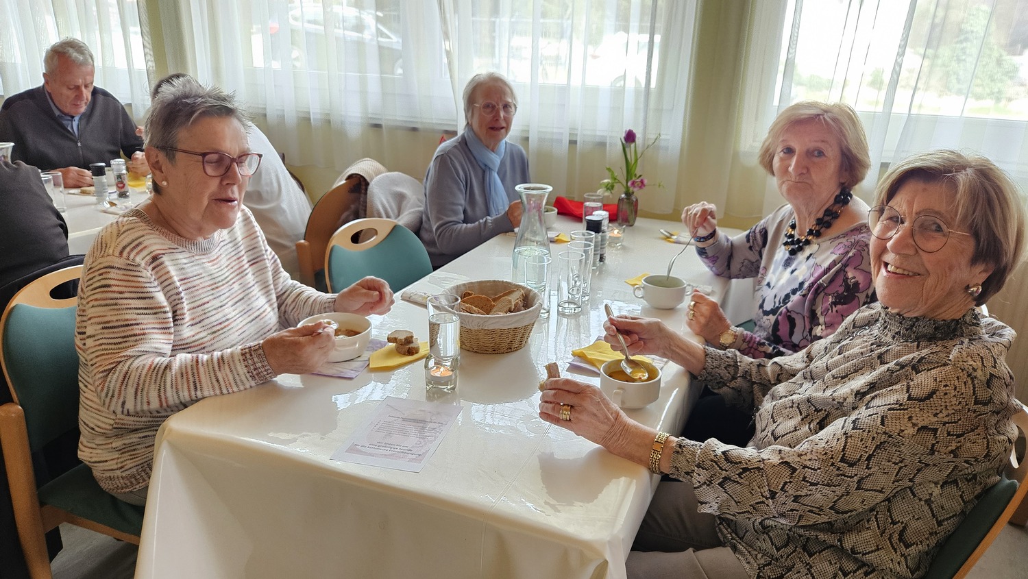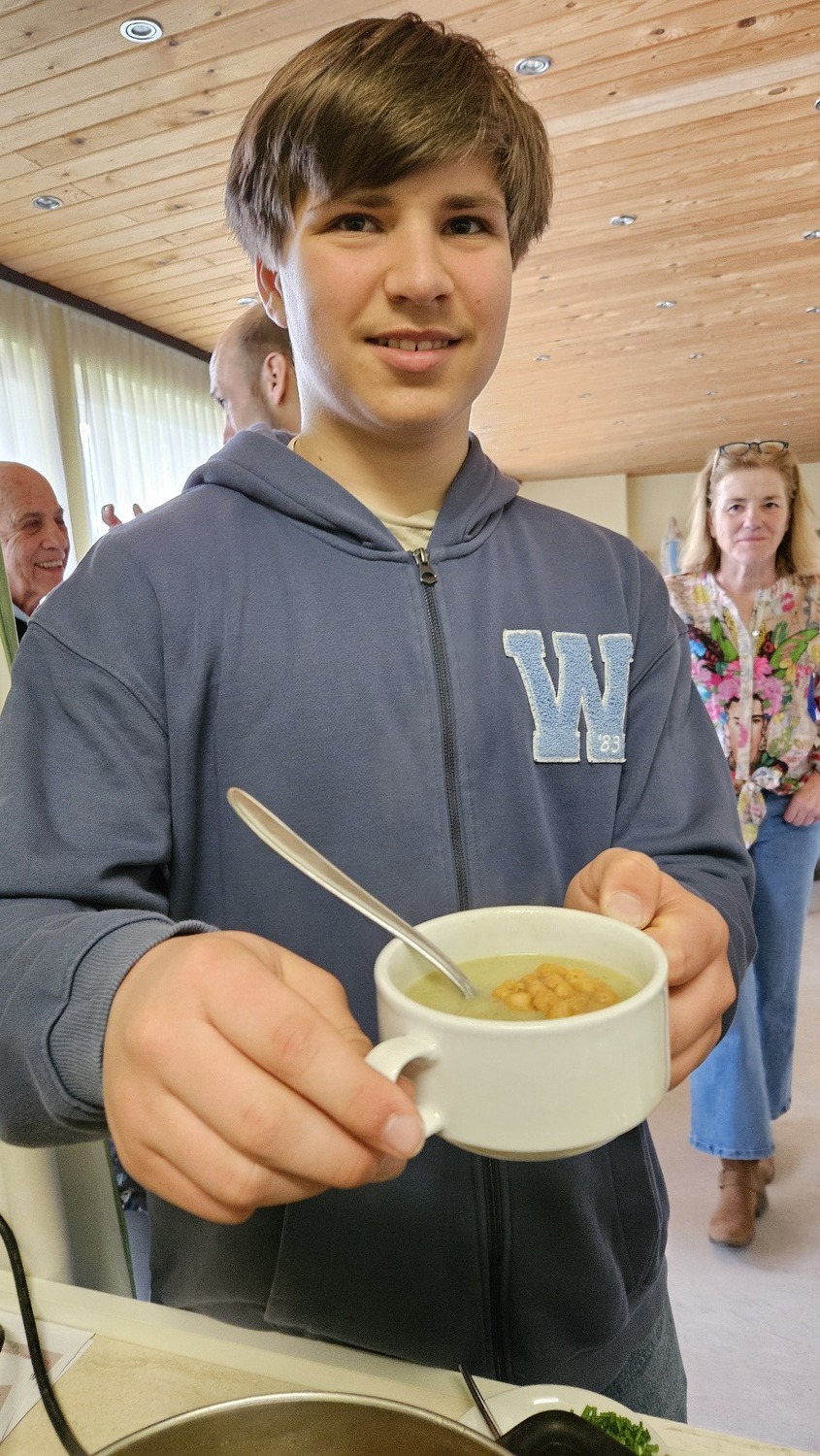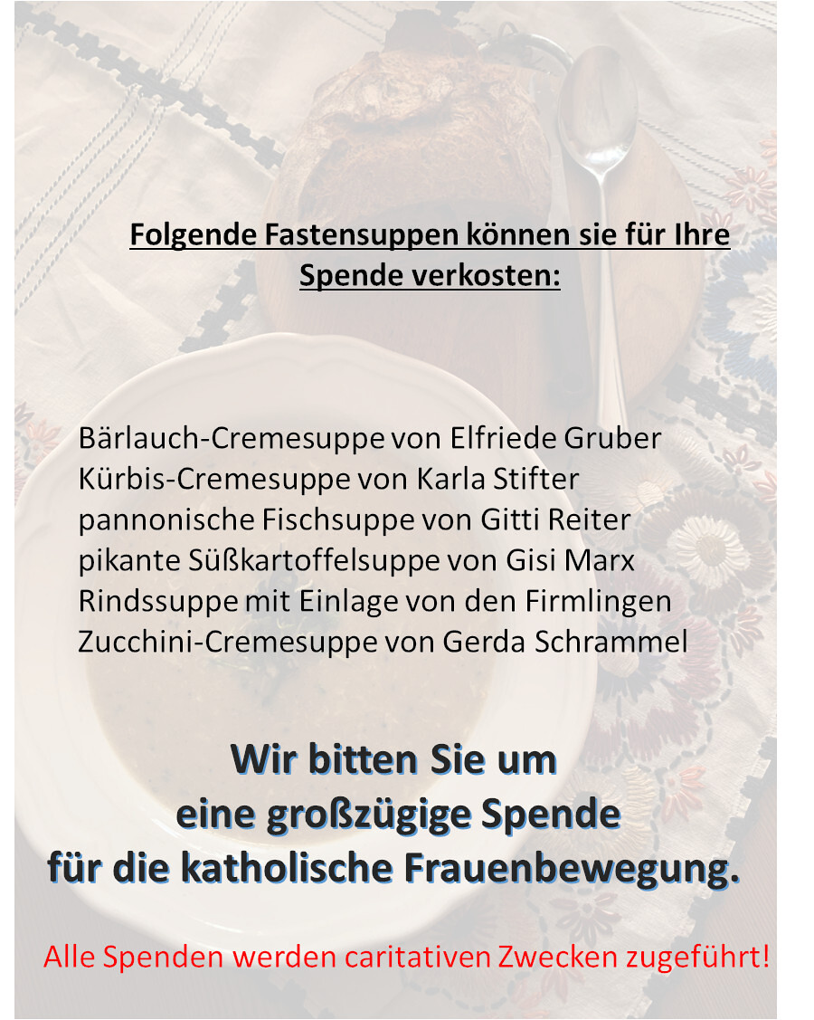 Wie alljährlich kochten Frauen der Pfarre Bad Sauerbrunn ganz ausgezeichnete Suppen. So konnte man für seine Spende eine pannonische Fischsuppe, eine pikante Süßkartoffelsuppe, eine Kürbiscremesuppe, eine Bärlauchsuppe mit Croutons oder eine Zucchinicremesuppe, aber auch die von der Firmlingsgruppe gekochten Gemüsesuppe mit Frittaten verkosten.