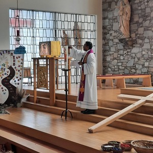 Bevor ausgewählte Stationen des Kreuzweges betrachtet und von Pfarrer Jomon erklärt wurden, durften einige Kinder versuchen ein großes Holzkreuz zu heben, um festzustellen wie schwer Jesus zu tragen hatte. Anschließend bekamen die Kinder einfache gebastelte Kreuze ausgeteilt, die dann bei den Stationen mit Bändern in den Farben Rot für Blut, Blau für die Tränen, Grün für die Hoffnung und Schwarz für den Tod von ihnen geschmückt wurden. Ein weißes Band durften die Kinder mit nach Hause nehmen um es zu Ostern, als Symbol der Auferstehung hinzuzufügen.