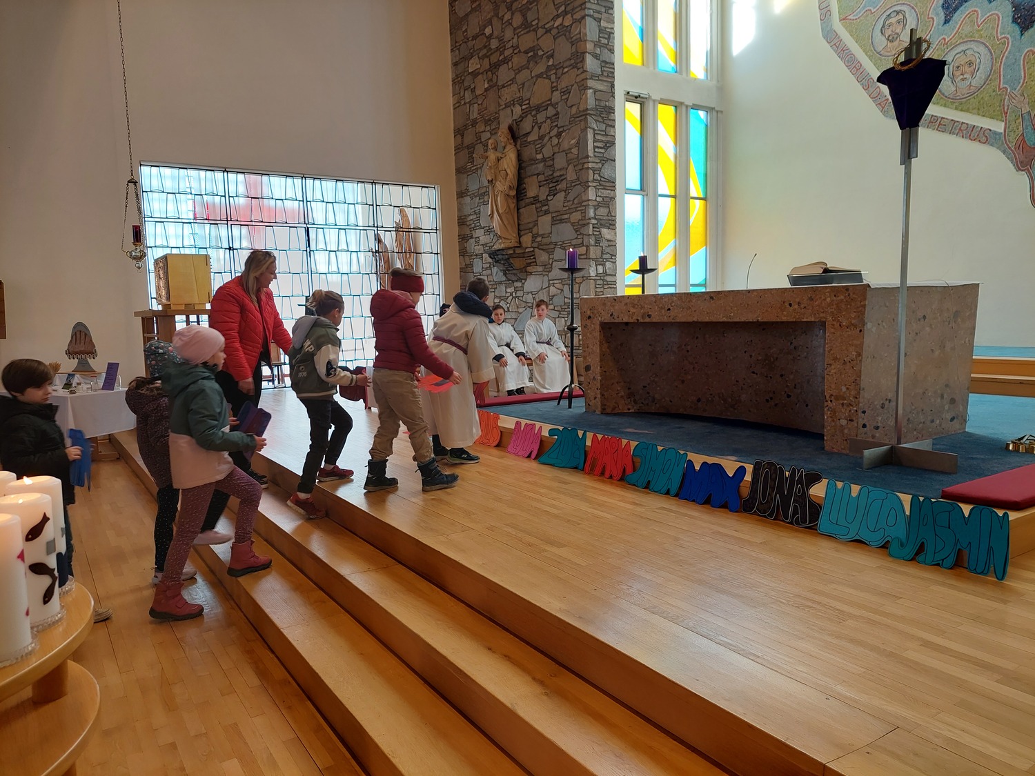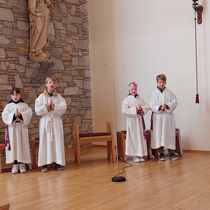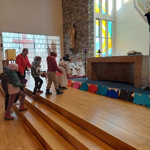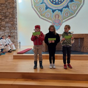 Die Schülerinnen und Schüler der Volksschule feierten gemeinsam mit P. Jomon, dem Lehrkörper und einigen Eltern sowie Großeltern einen feierlichen Ostergottesdienst.