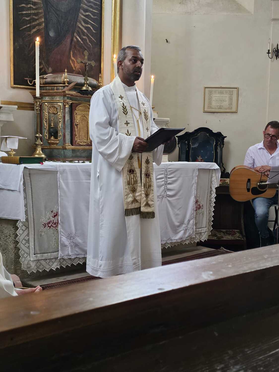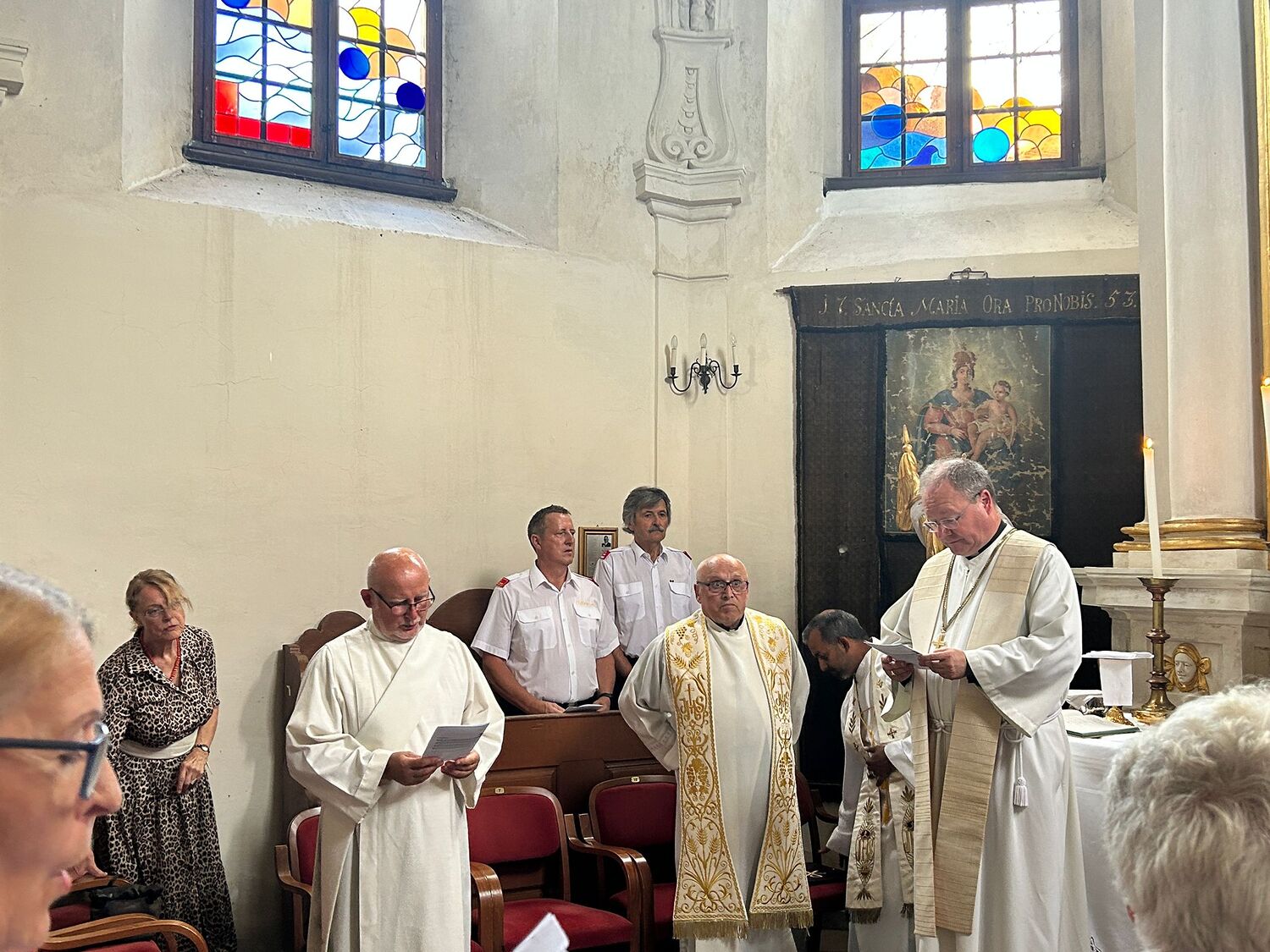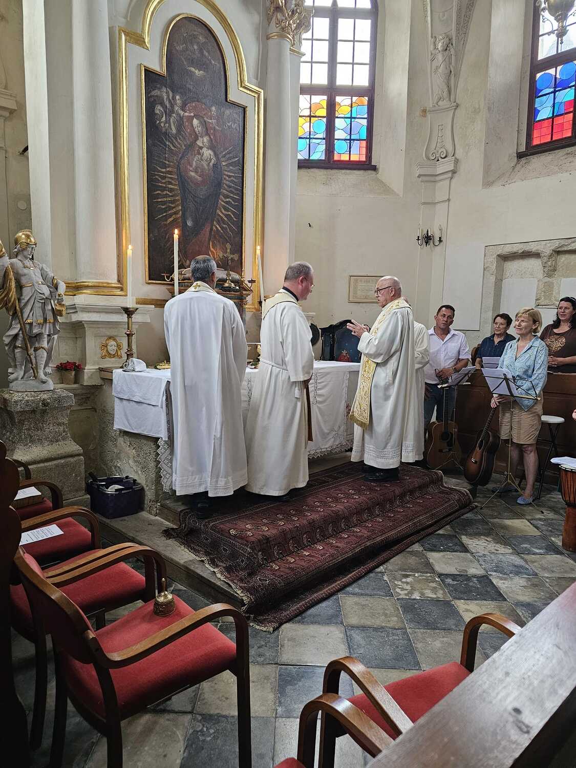 Am Donnerstag, dem 11. Juli 2024, um 16.00 Uhr, feierte der Pfarrverband Kobersdorf-Weppersdorf-Lackenbach in der Schlosskapelle Kobersdorf einen festlichen Gottesdienst mit dem Propst von Stift Klosterneuburg, Mag. Anton Höslinger, Dechant Mag. Shinto Varghese Michael, Altpfarrer Mag. Karl-Heinz Mück und Diakon Hubert Zach. Für die musikalische Umrahmung der Hl. Messe sorgte die sehr professionelle rhythmische Gruppe der Pfarre Kobersdorf unter der Leitung von Christa Reiner. Als Ministranten fungierten in ihren Feuerwehruniformen Feuerwehrkommandant Gerhard Klafsky und Richard Kampits. Den Mesnerdienst leistete der Kobersdorfer Mesner Fritz Ecker.