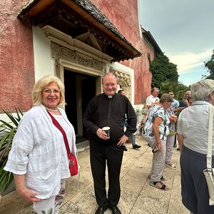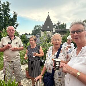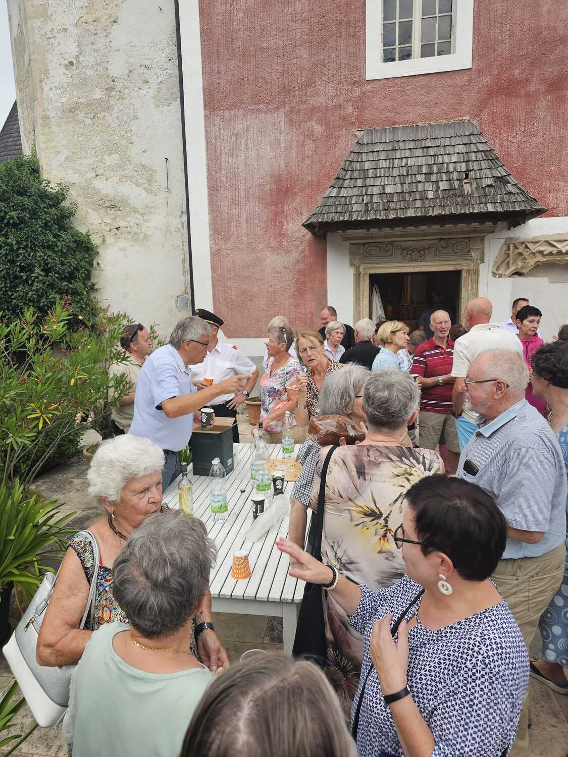 Nach dem Gottesdienst lud Dechant Shinto die Messeteilnehmer im Garten vor der Schlosskapelle zu einer Agape mit div. Gebäck, Grammel-Pogatscherl, Kuchen, Mineralwasser und Wein ein. Der Herr Dechant bedankte sich auch bei der Raiffeisenbank Draßmarkt-Kobersdorf-St. Martin und bei der Firma Waldquelle Kobersdorf für die Unterstützung und bei Schloss-Besitzerin Dr. Anna Schlanitz für die Möglichkeit, in der altehrwürdigen Schlosskapelle diese Hl. Messe zu feiern.