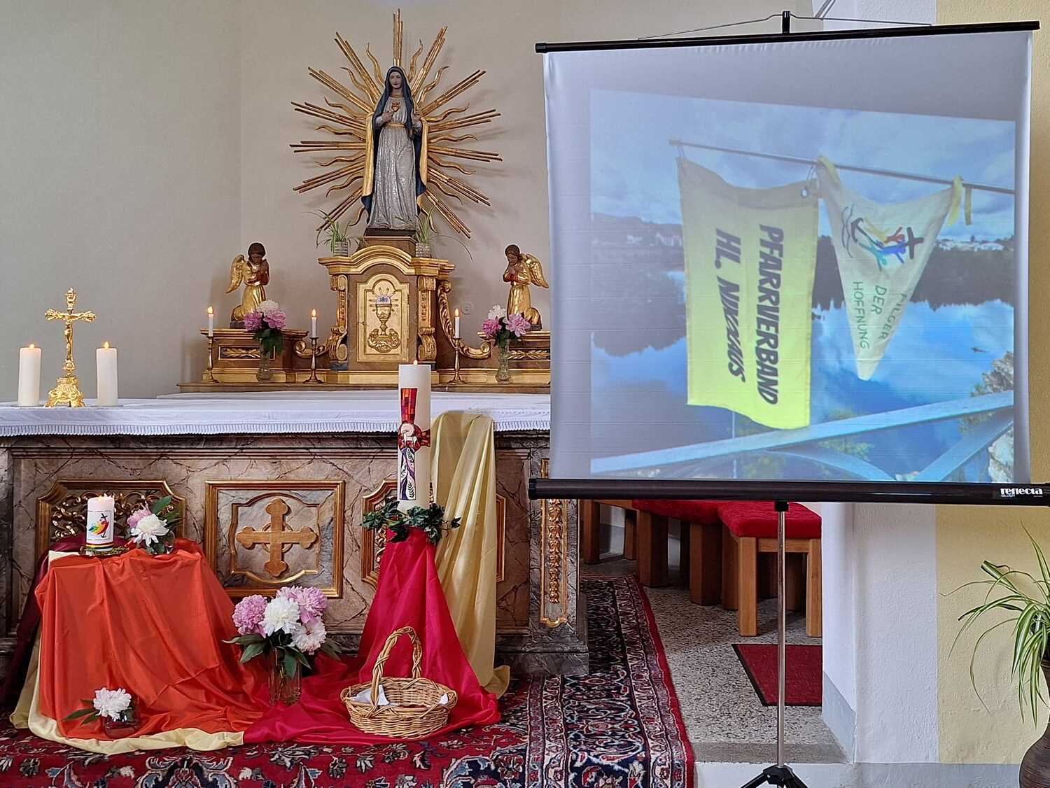 Als Zeichen der Verbundenheit mit der pfingstlichen Geistsendung und den Auftrag in der Welt zu wirken, wurden Herzen mit Attribute des hl. Geistes ausgeteilt.