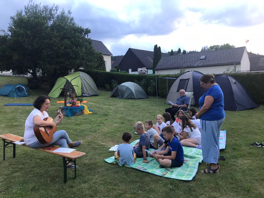 Ein stürmisches Gewitter ließ die Kinder leider nicht in ihren Zelten die Nacht verbringen. Trotz allem wurde die Nacht gemeinsam verbracht – im angrenzenden Pfarrsaal.