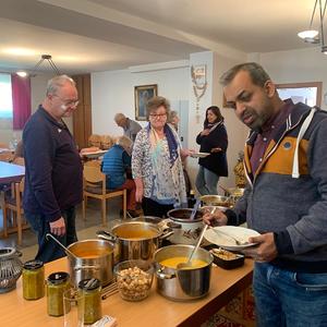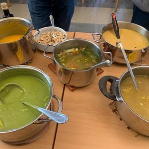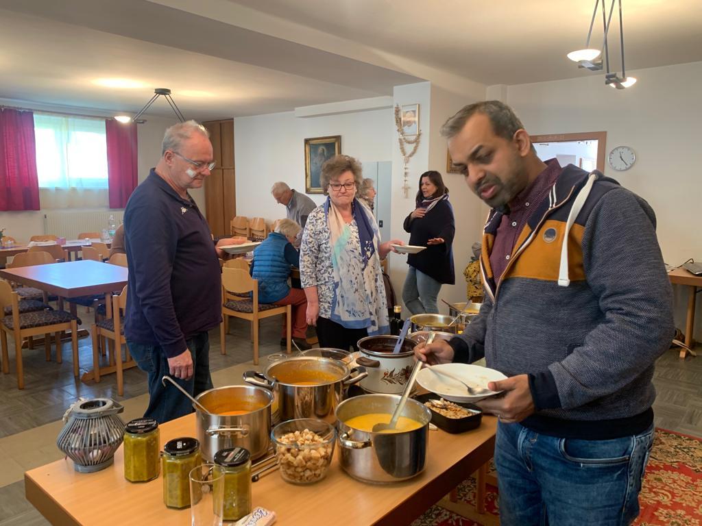 Anschließend gab es 16 verschiedene, köstliche Suppen zum Verkosten. Man konnte „Suppe im Glas“ mitnehmen, aber auch vor Ort konsumieren. Das Angebot wurde gut angenommen und viele waren froh, wieder in Gemeinschaft mit Anderen, Essen und Plaudern zu können.