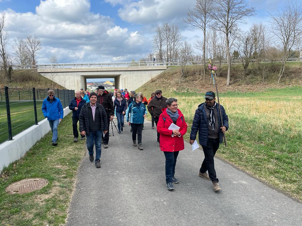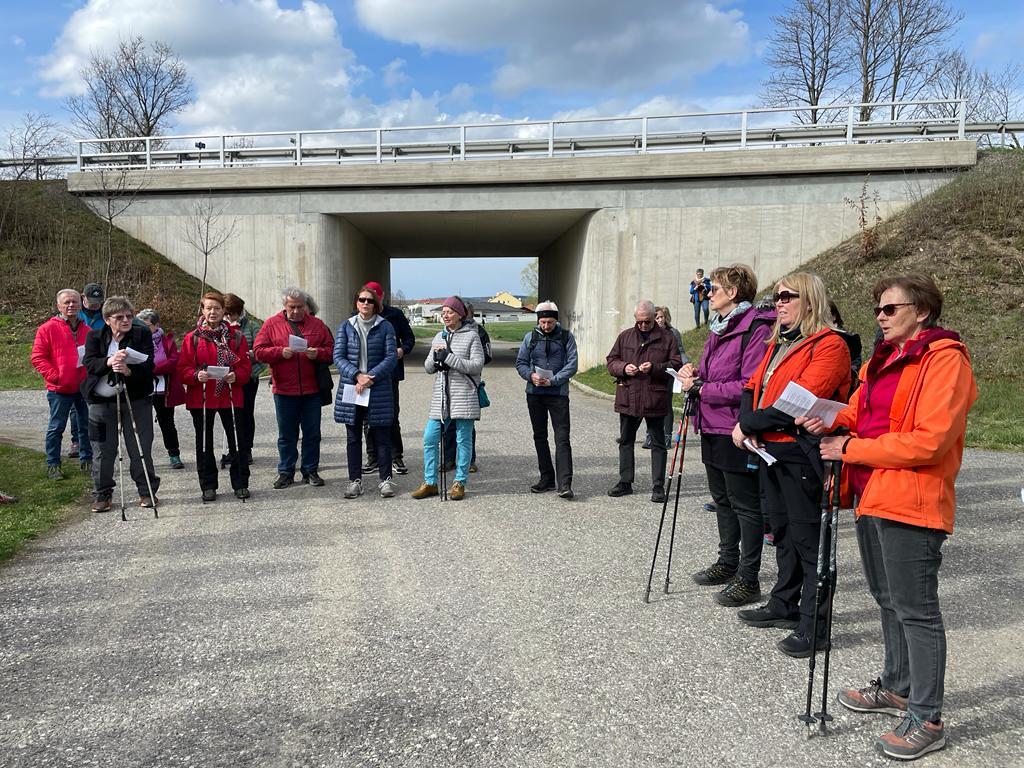 Nach dem Pilgersegen und einem gemeinsamen Gebet zum heiligen Martin brach die Gruppe nach Markt Sankt Martin auf. Bei der ersten Statio bedachten die Pilgerinnen und Pilger in einem Wechselgebet, was ihnen heilig ist, was sie schützen und wofür sie sich einsetzen wollen. Die Sorgen um die Schöpfung wurden Gott ebenso anvertraut, wie das persönliche Engagement für Umwelt und Gesellschaft. Bei der zweiten Statio wurde um den Schutz der Gottesmutter Maria gebetet.