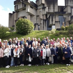 Beendet wurde der Ausflug mit einem Besuch der Wotrubakirche am Georgenberg in Wien-Mauer, welche in den 70-ger Jahren des 20. Jahrhunderts nach Entwürfen des Bildhauers Fritz Wotruba erbaut wurde. Das Kirchengebäude ist stilistisch dem Brutalismus zuzurechnen. Die Wotrubakirche, die heute zu den touristischen Sehenswürdigkeiten von Wien zählt, wirkte auf die knapp 60 Reiseteilnehmer sehr beeindruckend.