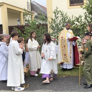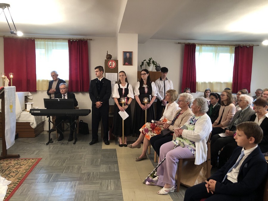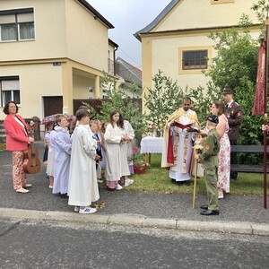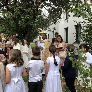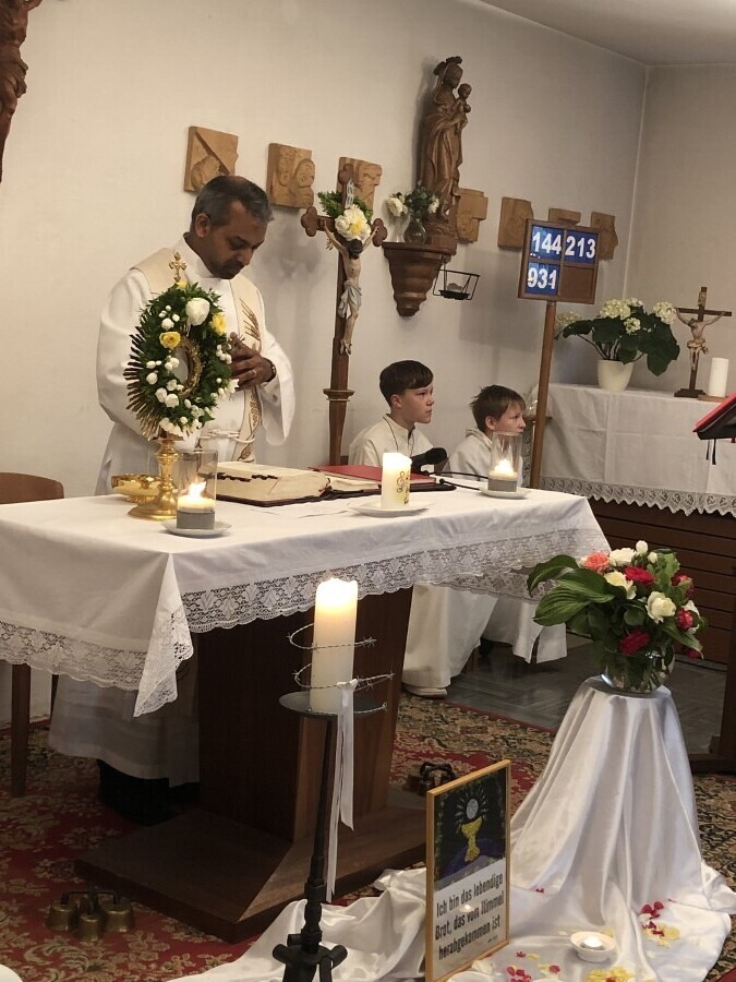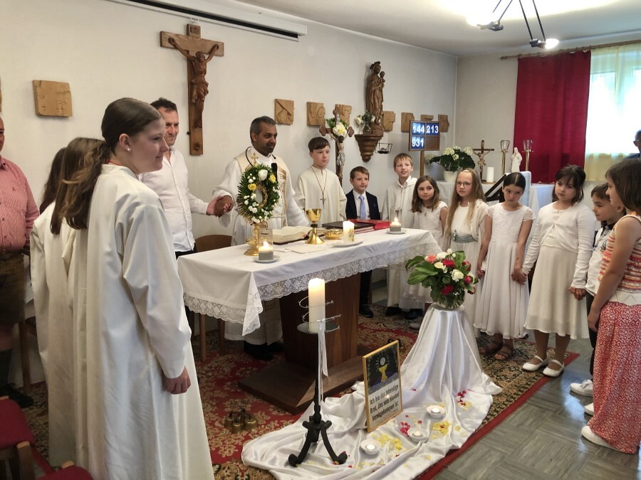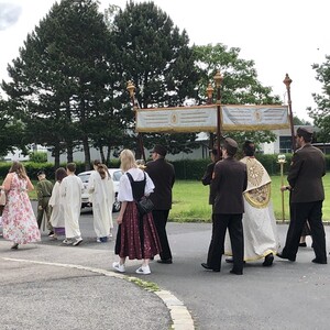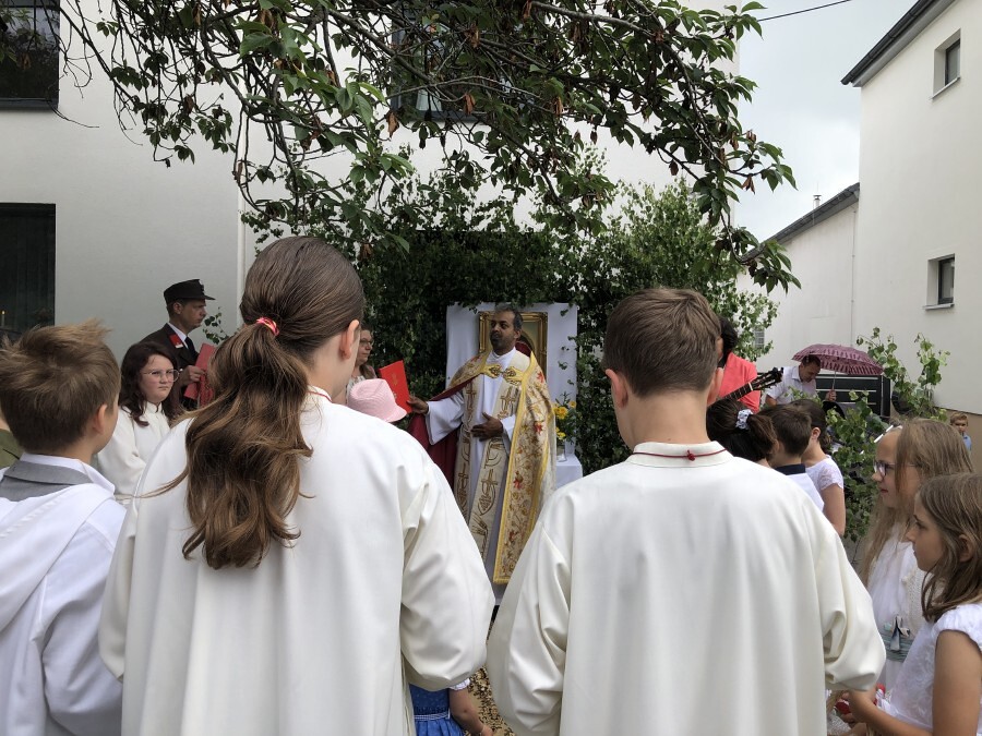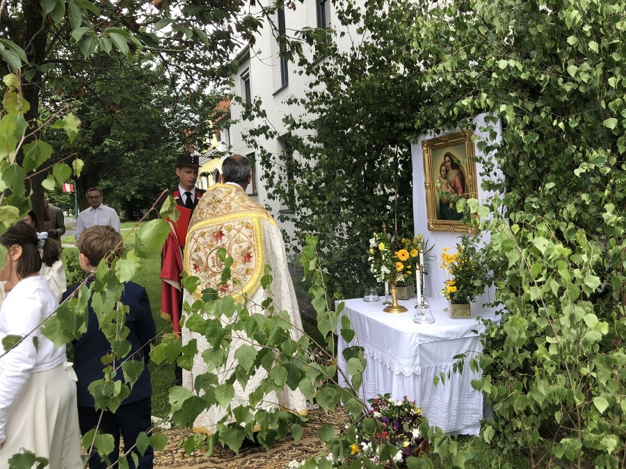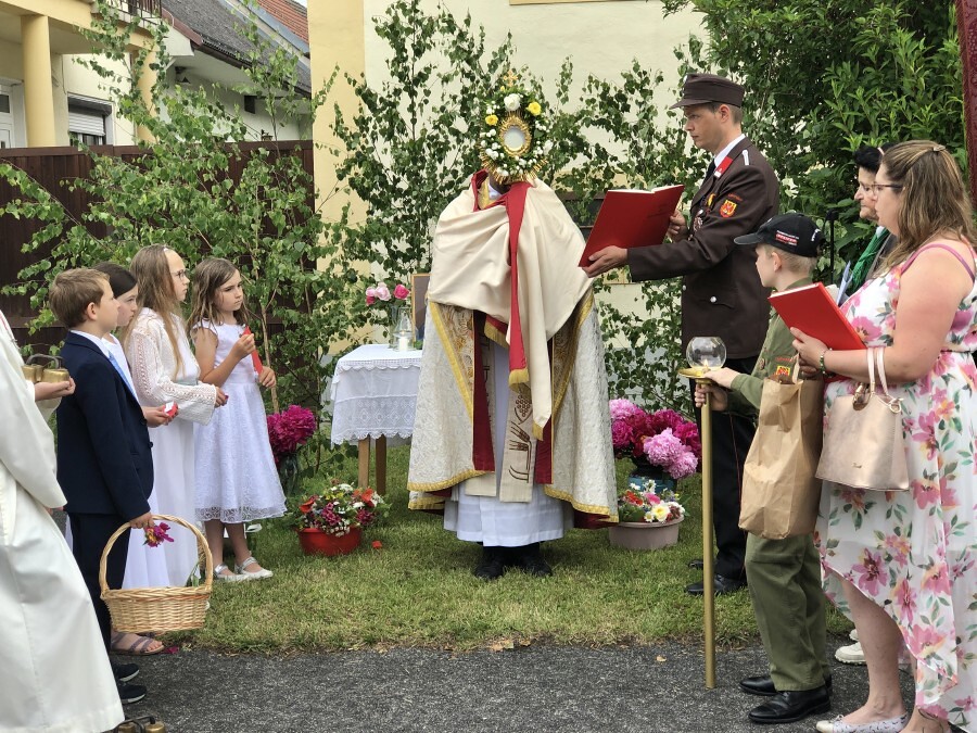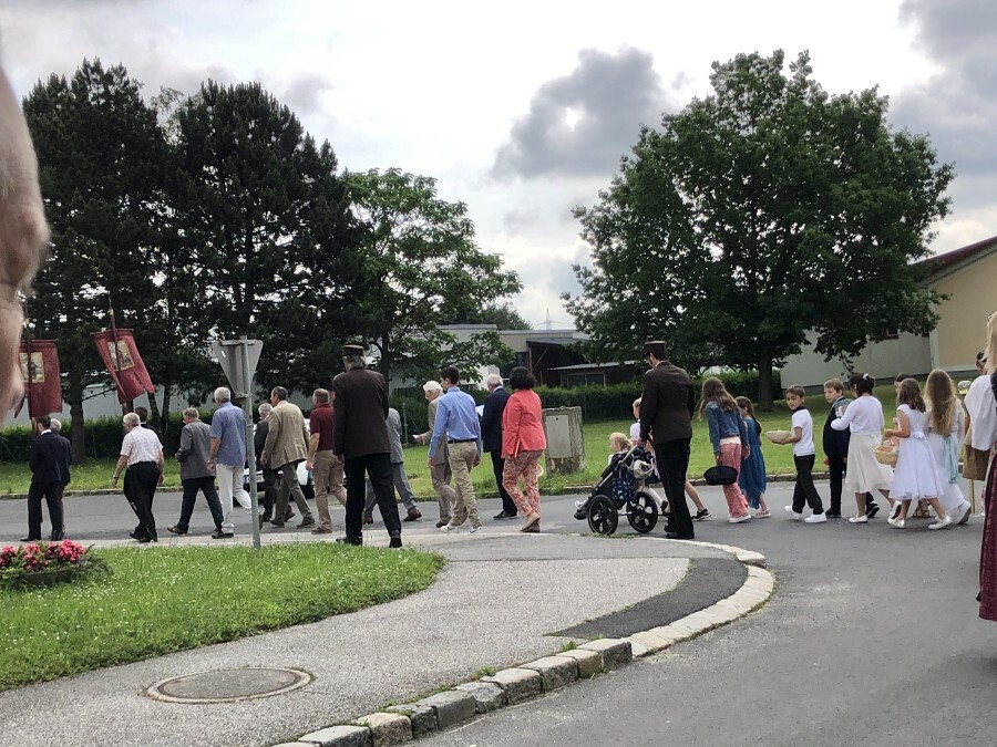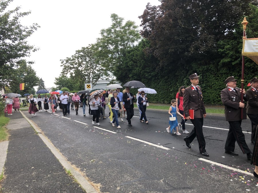 Wetterbedingt musste der Ablauf in Kobersdorf kurzfristig geändert werden. Begonnen wurde mit der Prozession zu 3 Altären, die sehr liebevoll gestaltet waren. Ein schönes Zeichen setzten unsere Erstkommunionkinder mit ihren Tischmüttern, die die erste Station mit Musik und Texten mitgestaltet haben. Die Hl. Messe fand im Anschluss im Pfarrsaal statt.