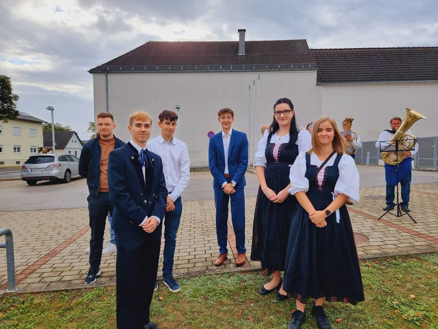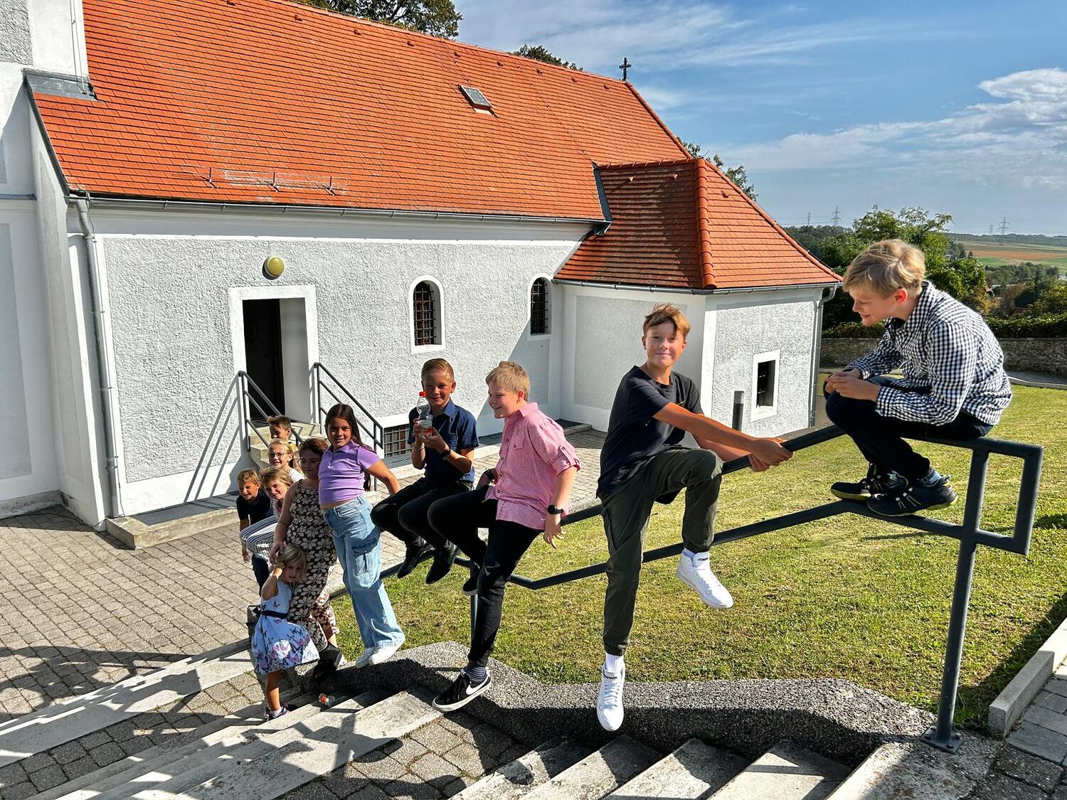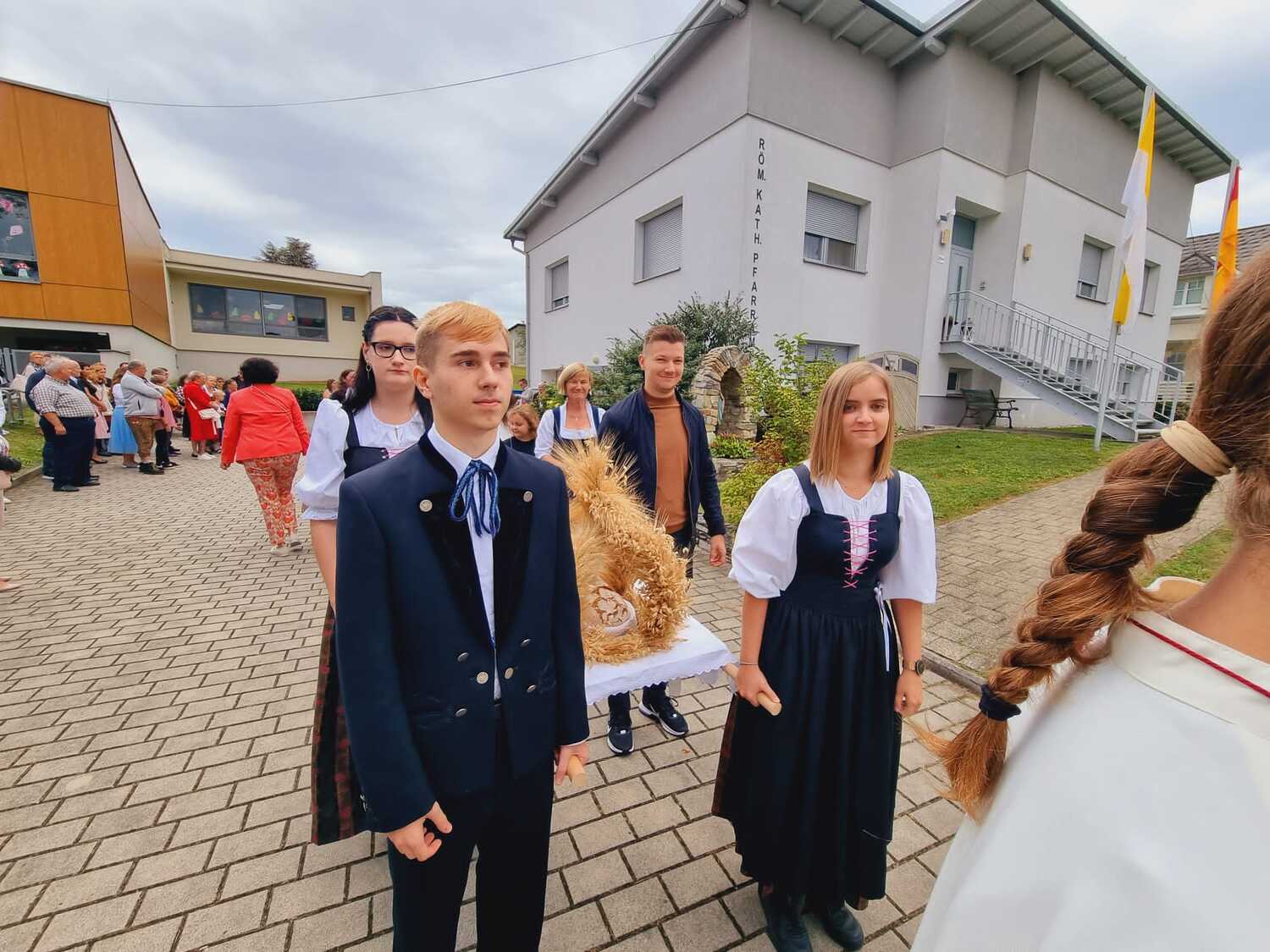 Das Kirchenvolk versammelte sich beim Pfarrhof, wo Herr Diözesanbischof Ä. Zsifkovics von den Kindern feierlich begrüßt wurde. Nach der Segnung der Erntekrone führte ein langer Festzug, angeführt vom Kreuz mit den Ministranten und der Blaskapelle Kirchschlag zum Gotteshaus, wo unser Herr Bischof dann die Segnung vornahm.