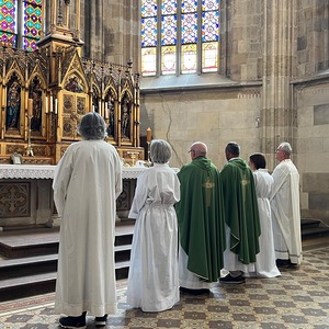 Um 10.00 Uhr feierten Dechant Shinto und Pfarrer Mück mit dem Pfarrverband einen feierlichen Gottesdienst im Martinsdom von Bratislava, welcher von Christa Reiner und mehreren Sängerinnen musikalisch gestaltet wurde. Nach einer Domführung startete – in 3 Gruppen – der erste Teil der Stadtführung. Besichtigt wurden u. a. die Venturgasse, die Michaelergasse mit dem Michaelertor, der Hauptplatz mit dem Alten Rathaus und dem Maximilianbrunnen sowie die Alte Oper. Ein Höhepunkt war die Außen- und Innenbesichtigung des Primatialpalastes.