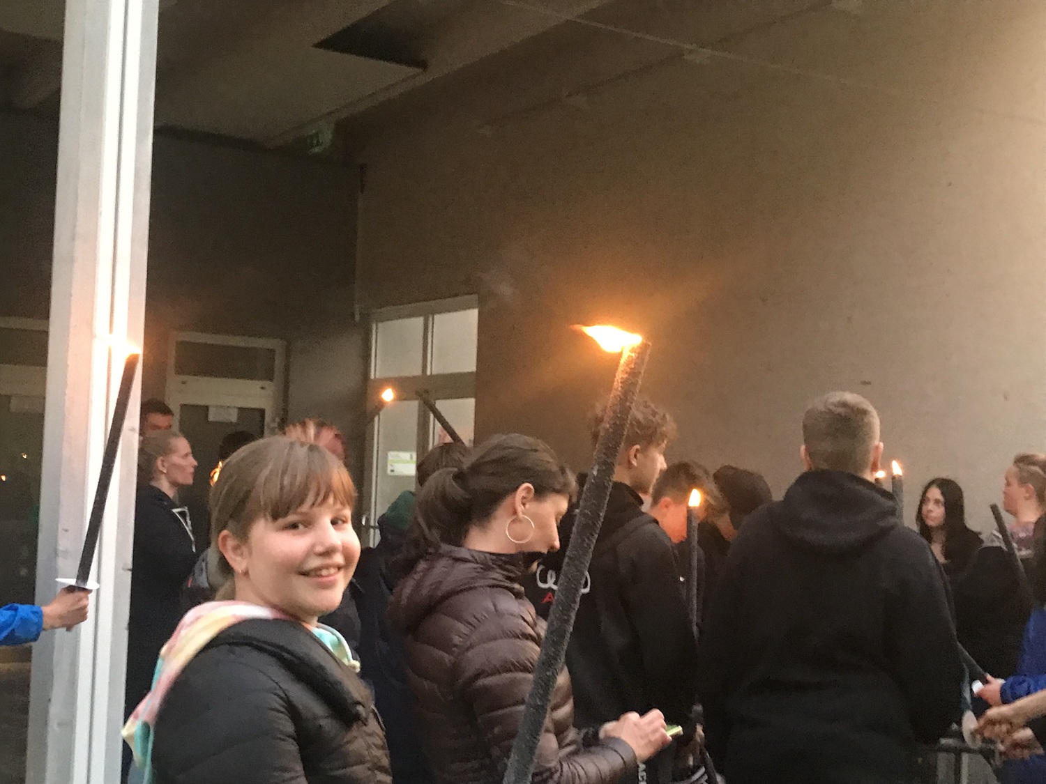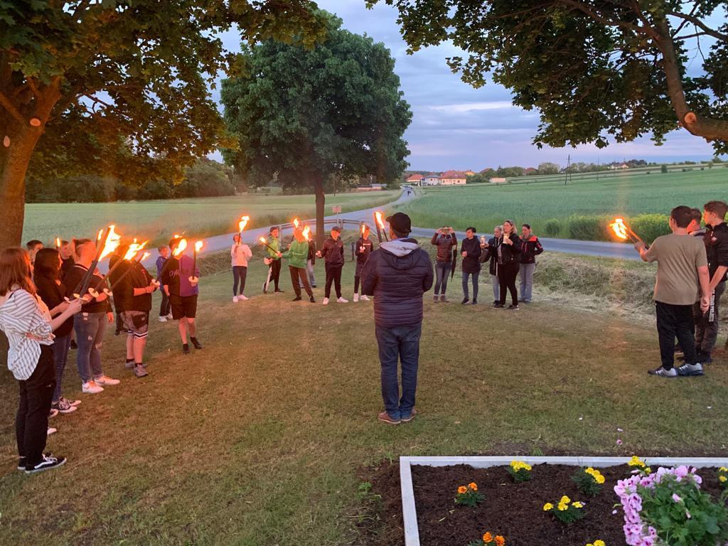 Bevor die Gruppe dann mit ihren Fackeln zur Wanderung aufbrach, gab es noch eine kleine Jause. In wunderbarer Abendstimmung mit bester Laune marschierten die Jugendlichen zur Florianisäule, wo der stimmungsvolle Abend mit einer Andacht endete.