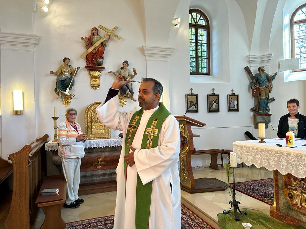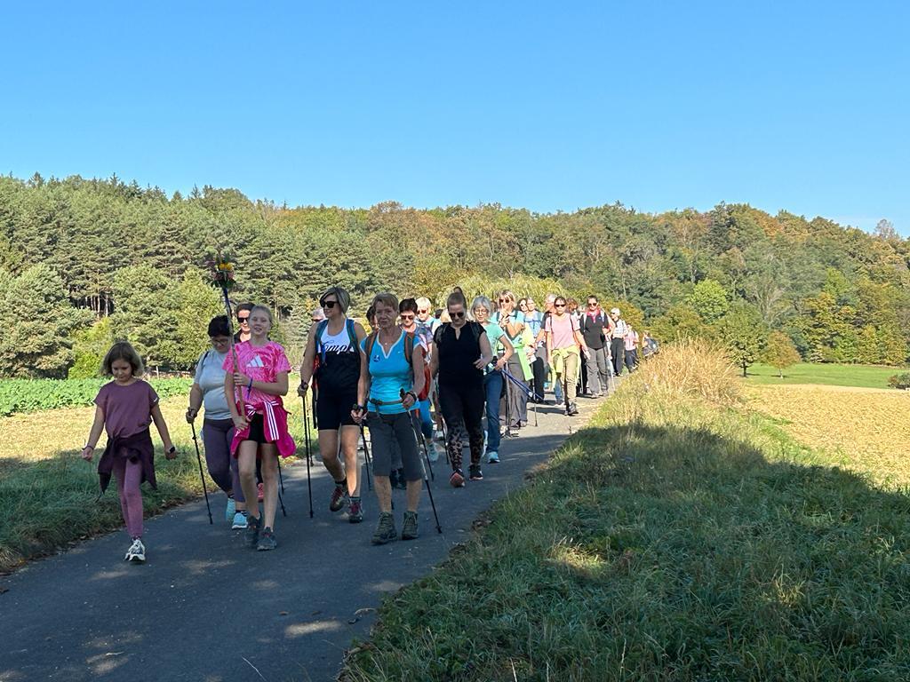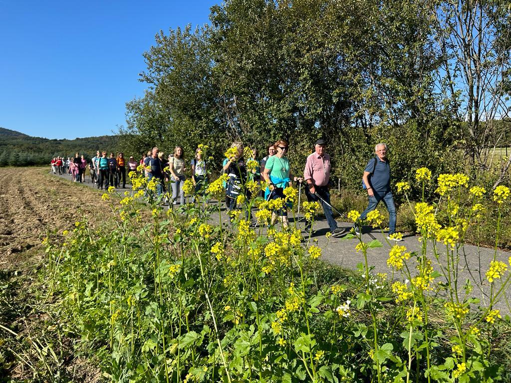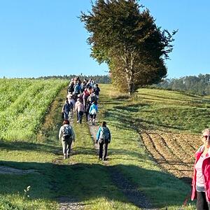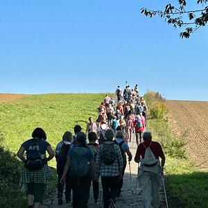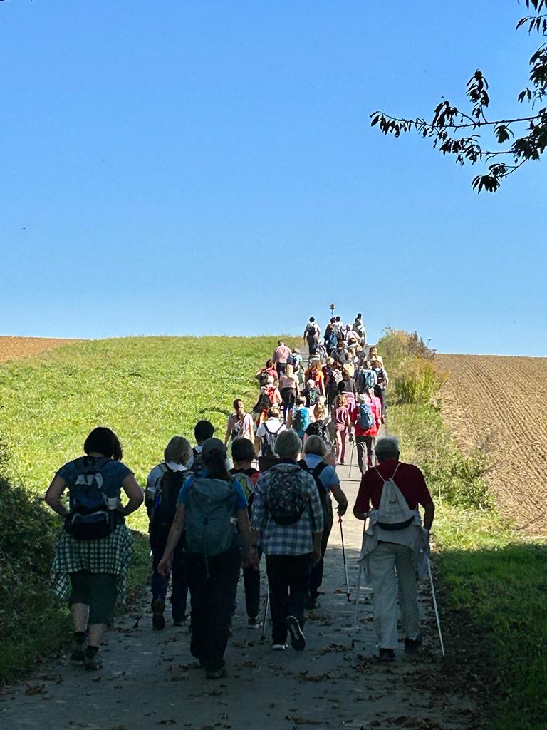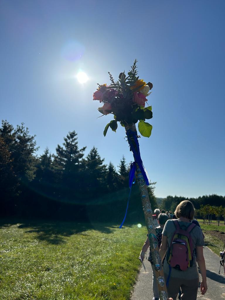 Mit diesem Gebet, mit dem gesegneten Pilgerstab und den Segen Gottes, erteilt von Pf. Shinto, machten sich 53 Frauen und 4 Männer auf den Weg um ca. 10 km bei strahlendem Sonnenschein, am Fuße der Landseer Berge zu pilgern.