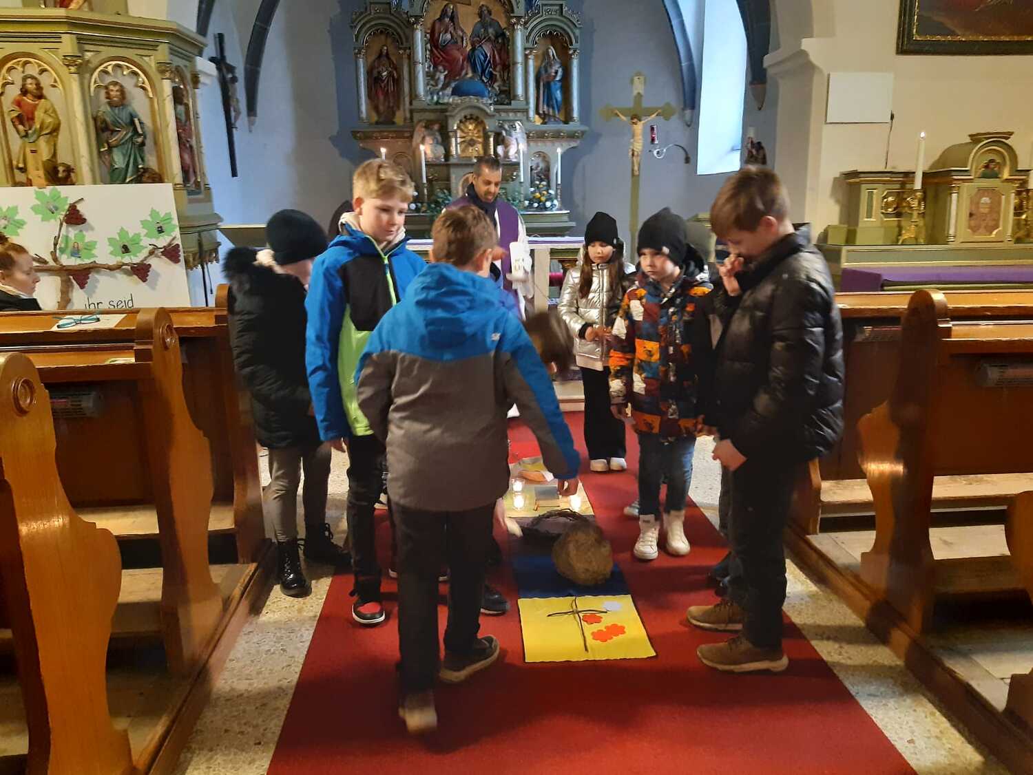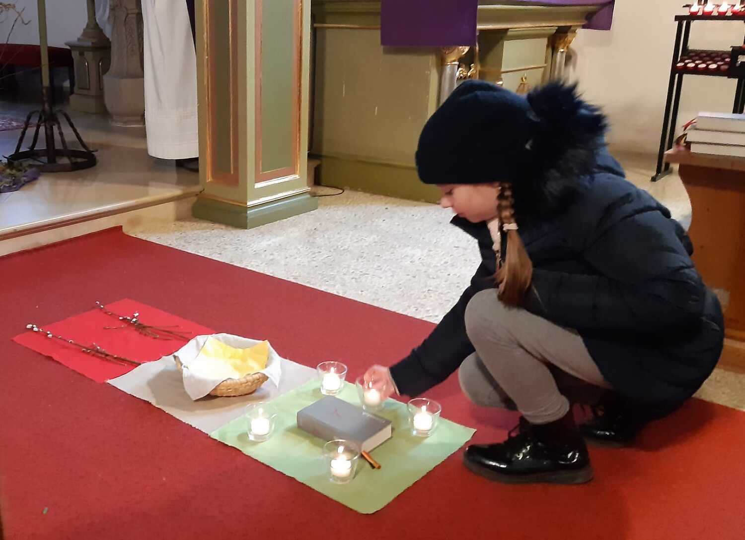 In 6 Stationen konnten die Kinder mit verschiedenen Symbolhandlungen den Weg Jesu nachgehen. Begonnen wurde zum Einzug in Jerusalem mit einem Palmzweig in den Händen mit einem gemeinsamen Lied. Zum Zeichen des letzten Abendmahles wurde Brot geteilt und gegessen und anschließend an Jesu am Ölberg gedacht und jeder durfte zum gemeinsamen VaterUnser ein Teelicht entzünden. Die Schmerzen und das schwere Leid wurde mit einer Dornenkrone und einem schweren Stein dargestellt. Zur Kreuzverehrung wurde dann das dunkle Kreuz mit bunten Blumen verschönert.