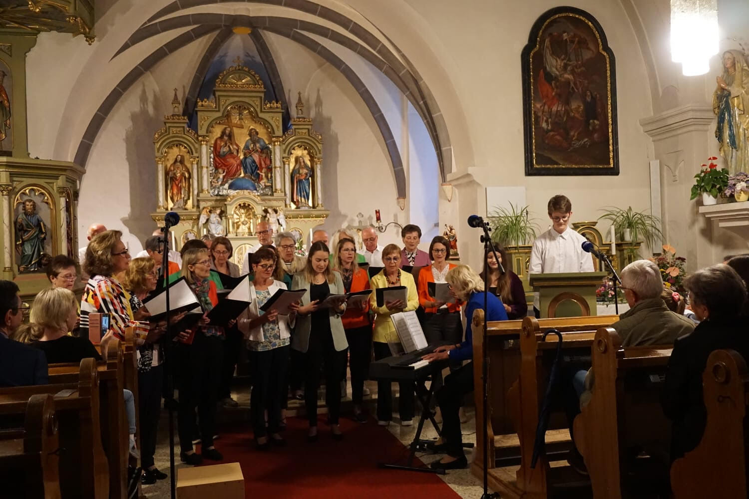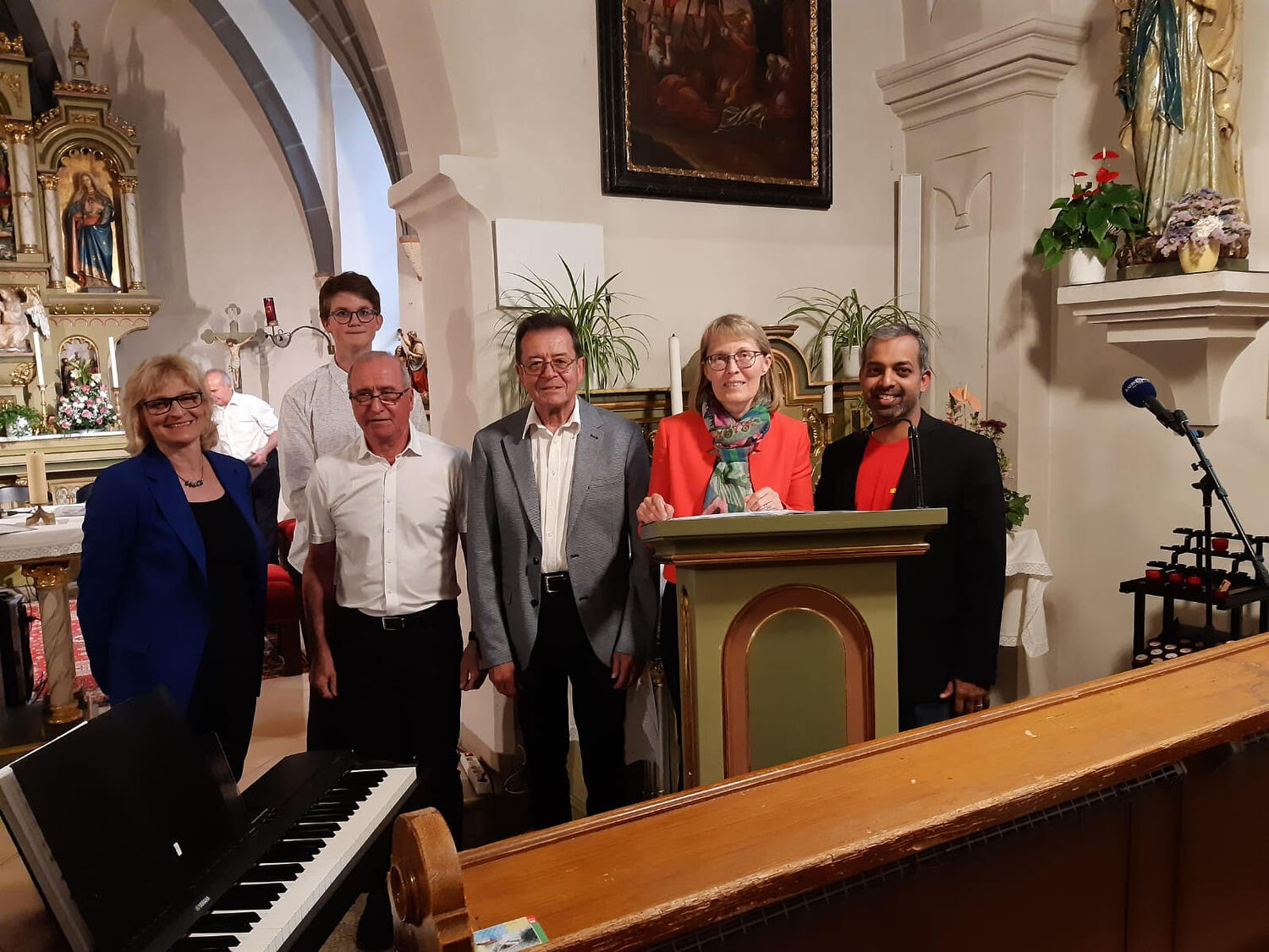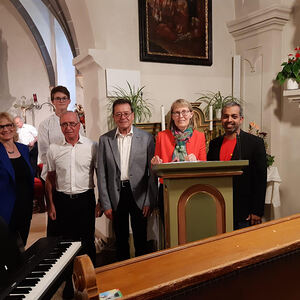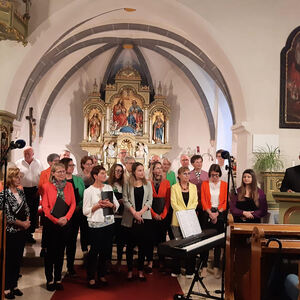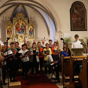Der nächste Programmpunkt führte in die katholische Kirche. Unter der Leitung von Barbara Magyar Grabner sangen evangelische und katholische Frauen und Männer unter dem Motto „Bleibe bei uns Herr“ gemeinsam verschiedene Segenslieder für die zahlreichen Gäste. Zwischen den Liedern wurden stimmungsvolle Gedanken und Gebete vorgetragen. Außerdem erzählten Josef Bertha und Pfarrer Shinto aus der Geschichte der Dreifaltigkeitskirche.