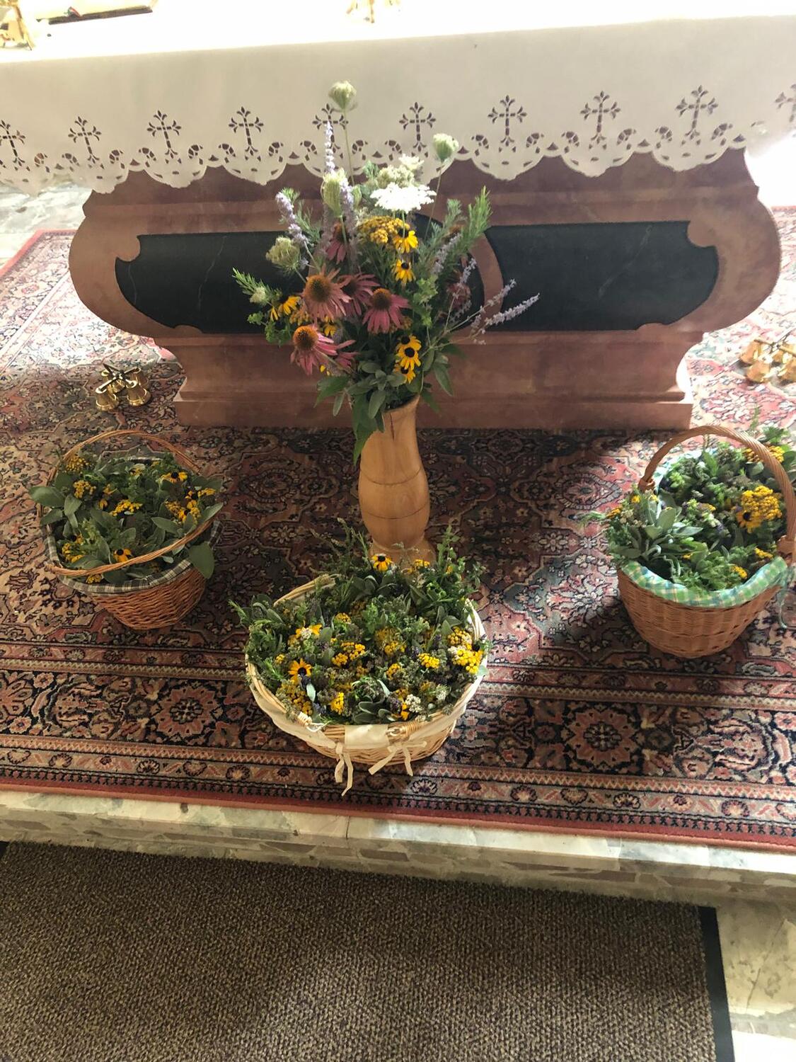 Auch in den Filialen Lindgraben und Tschurndorf wurden mit viel Eifer Kräuter gesammelt und von den Frauen zu wunderschönen Sträußen gebunden. Pfarrer Shinto segnete diese im Rahmen des Patroziniumsfestes in Tschurndorf und nach der Vorabendmesse in Lindgraben. Am Ende der Heiligen Messen wurden diese an die Gottesdienstbesucher verteilt und durften mit nach Hause genommen werden.