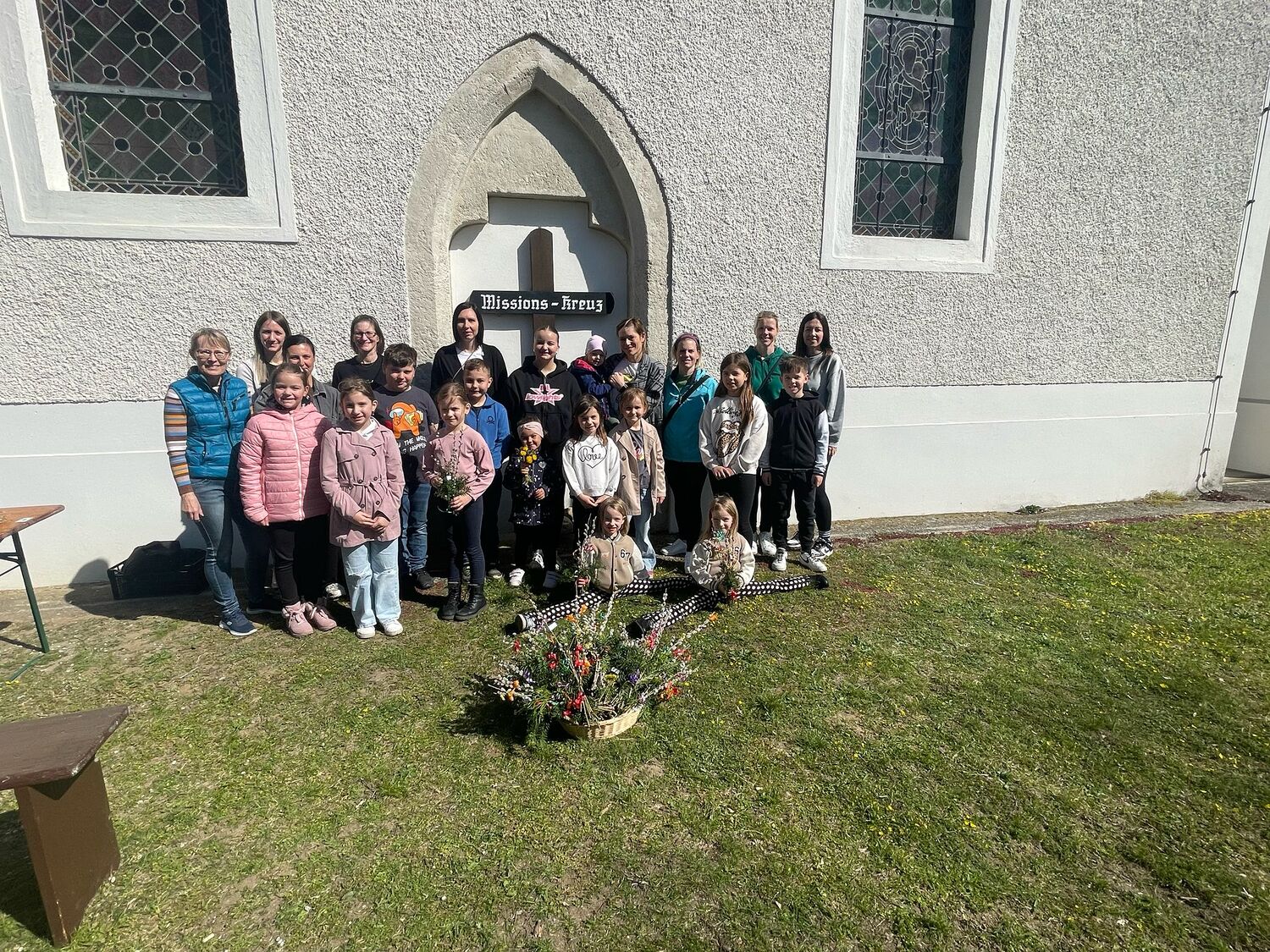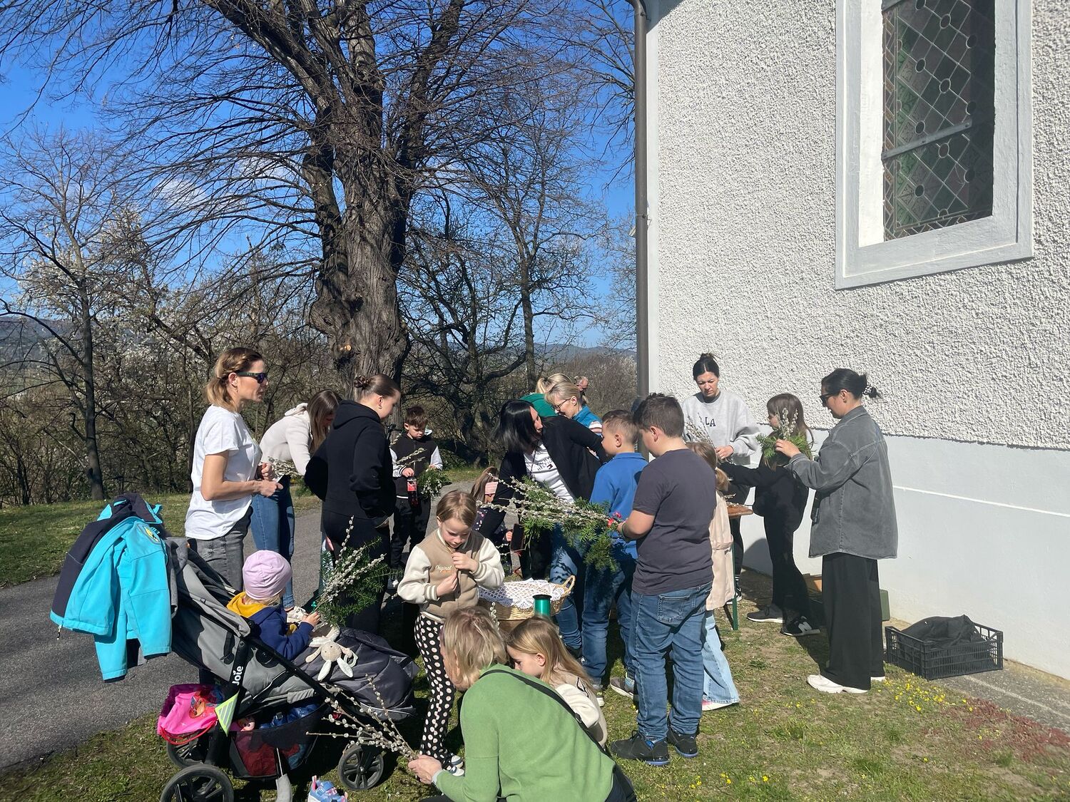 In der Woche vor Palmsonntag trafen sich die Kinder zum gemeinsamen Palmbuschenbinden. Diese werden am Palmsonntag gesegnet und sind ein Zeichen des Lebens und des Sieges über den Tod.
