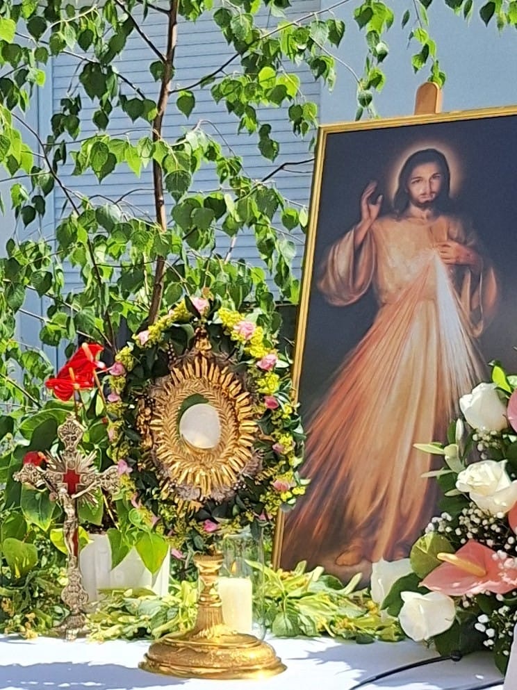 Im Anschluss an die Messe zog die Gemeinde in einer feierlichen Prozession mit dem Allerheiligsten durch die Straßen unseres Ortes. Der Weg führte zu vier festlich geschmückten Altären, die von engagierten Gemeindemitgliedern liebevoll vorbereitet worden waren. An jedem Altar wurde das Evangelium verkündet, Fürbitten gehalten und der sakramentale Segen gespendet.
