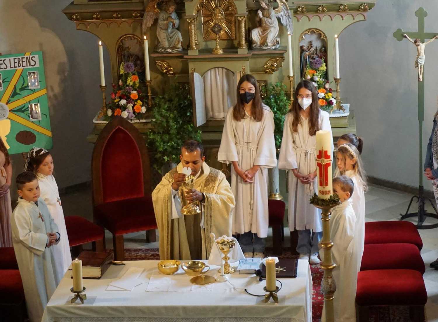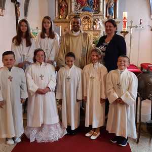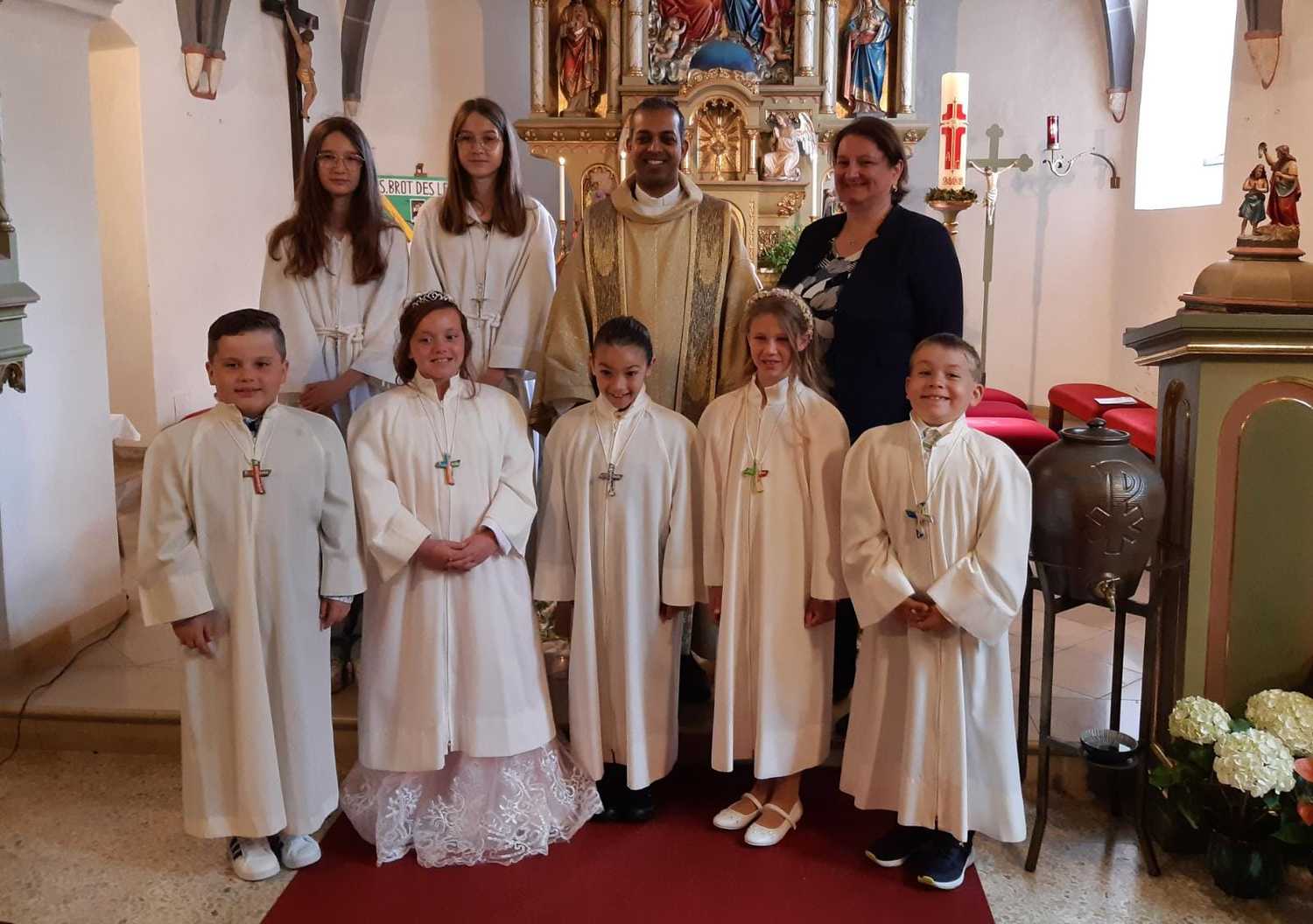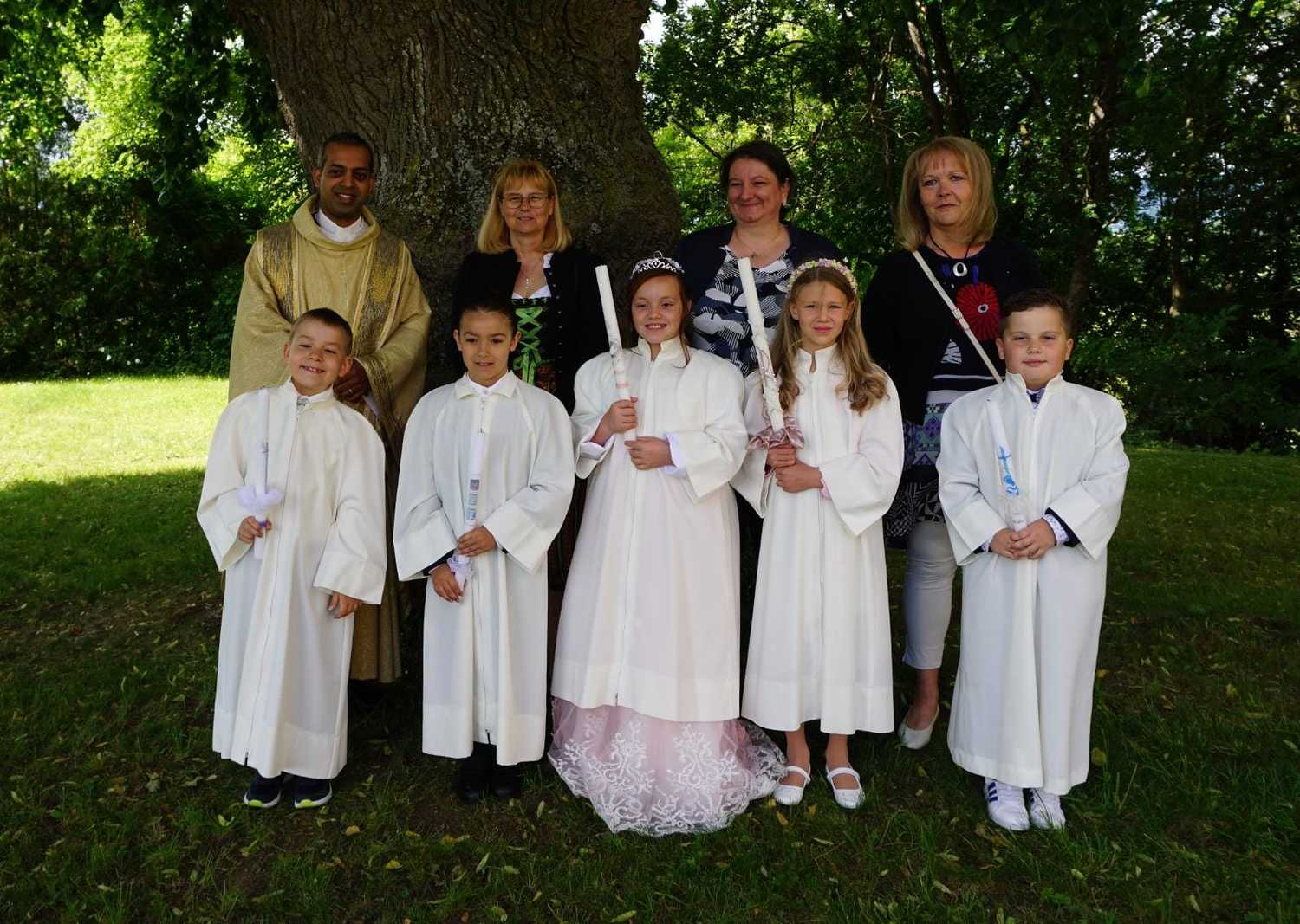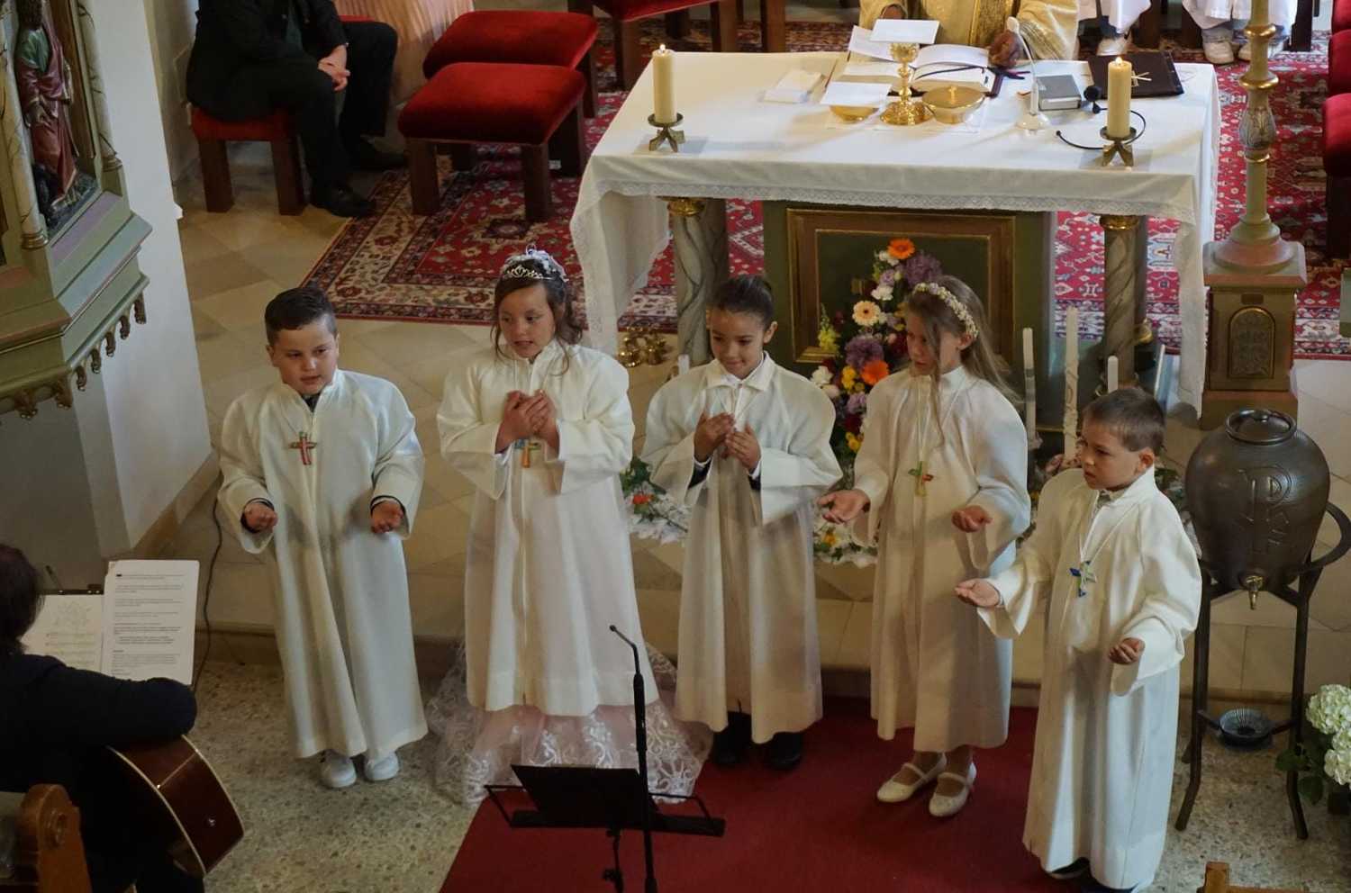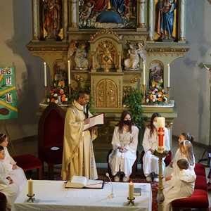 Am Samstag, dem 28. Mai wurden 5 Kinder in die Mahlgemeinschaft Jesu aufgenommen. Sie zogen mit ihren Paten, der Frau Religionslehrerin und den brennenden Taufkerzen in die wunderschön geschmückte Kirche ein und feierten ein Fest, das ihnen lange in Erinnerung bleiben wird.
