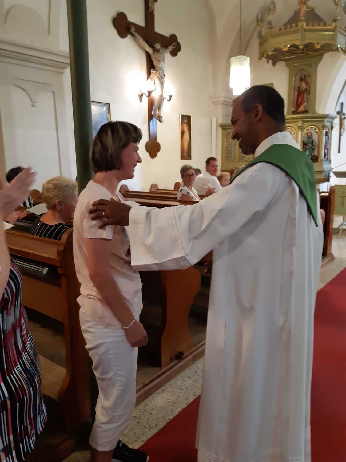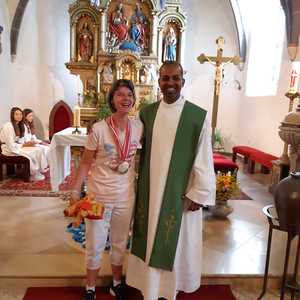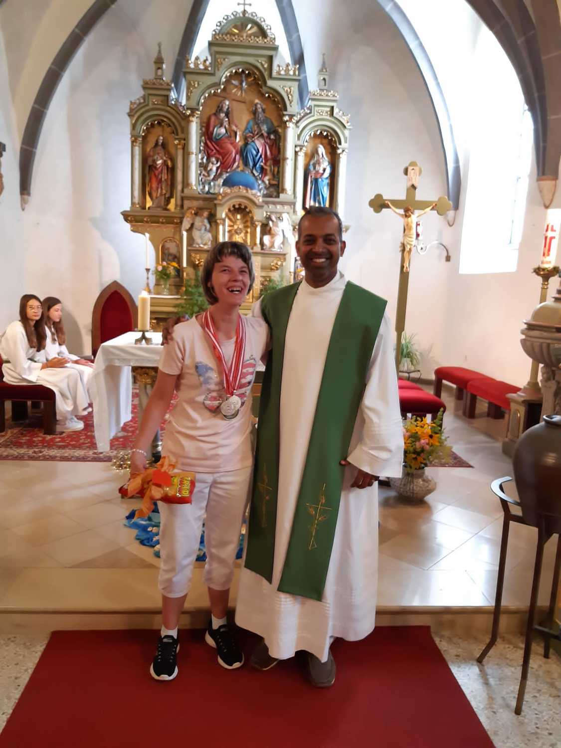Im Rahmen der Messe gratulierte Pfarrer Shinto auch den beiden Teilnehmern Lisa Blahna und Nico Geissler (der leider erkrankte und beim Gottesdienst nicht dabei sein konnte), die bei den Special Olympics teilnahmen und Medaillen mit nach Hause brachten.