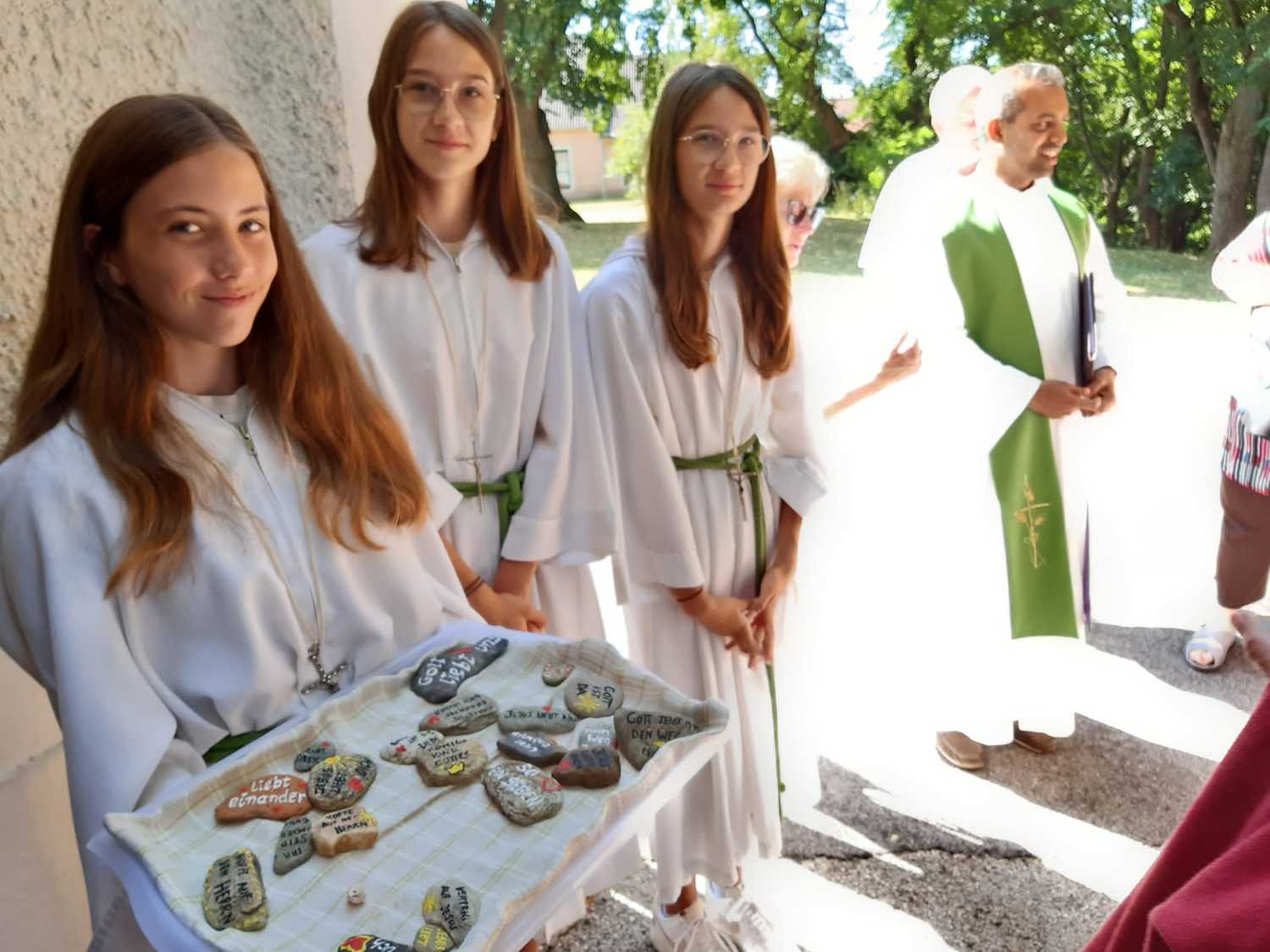 Jungscharleiterin Katja bereitete bunt bemalte Steine mit einer Botschaft vor, die die Kirchenbesucher mitnehmen durften, und diese in den kommenden Tagen und Wochen bei ihrem Urlaub, Reise, Ausflug an einen öffentlichen Ort legen sollen – dorthin, wo man denkt, dass sich jemand freut, von Gott und Jesus zu hören. Wir alle haben ja den Auftrag von Jesus erhalten, überall von Gott zu erzählen. Dieser Stein soll ein Symbol und Sprachrohr für uns sein.