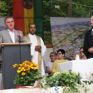 Die 800-Jahr-Feier, die am 14. August begangen wurde, war ein gelungenes Fest, zeigte sich doch das Wetter von seiner besten Seite. Begonnen wurde der Tag mit einem ökumenischen Festgottesdienst mit Hr. Pfarrer Stefan Grauwald und unserem Hr. Pfarrer Shinto Michael. Mitgestaltet wurde die Feier von den Kindern, die außerhalb der Kirche einen Kinderwortgottesdienst feierten und dann mit ihren selbstgestalteten Herzplakaten dazu kamen. Als kleine Erinnerung verteilten die Kinder am Ende des Festes selbstgebastelte Herzen mit dem Bibelspruch zum heutigen Evangelium Joh. 15,12: "Liebt einander, so wie ich euch geliebt habe."